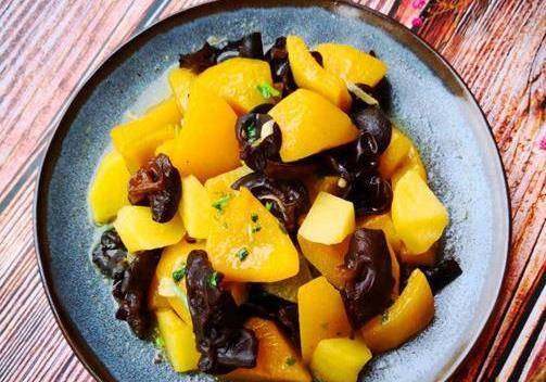 第四个想要介绍给大家的美食就是南瓜土豆炒木耳,木耳和南瓜土豆放一起,不仅看上去有食欲,而且营养也是更多,肯定能满足你挑剔的口味