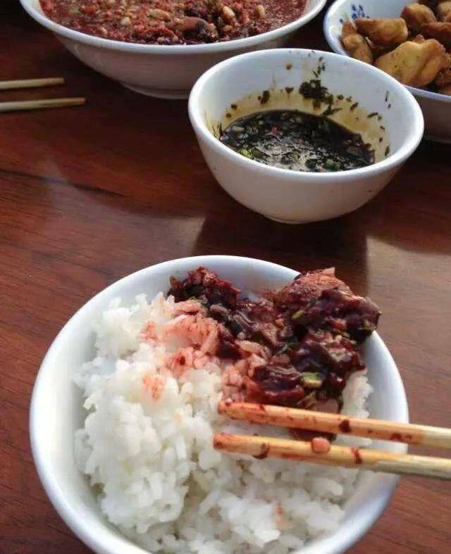 用从山上砍来的橄榄树做原料的凉拌猪肉“橄榄生”,最有特色的是用新鲜生猪血拌制的称为“白旺”的这道菜。瞧他们的吃法便可看出其味美无比。想挑战这菜吗?欢迎你来我的家乡做客!
