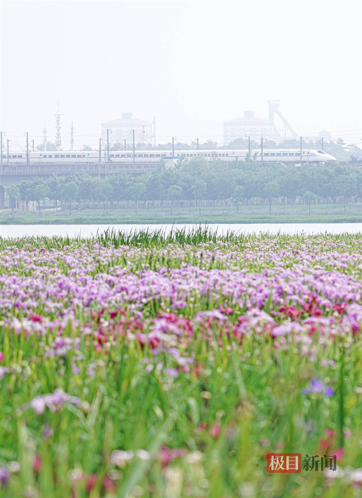 5月11日,武汉杨春湖,绽放的鸢尾花和奔驰的动车同框。