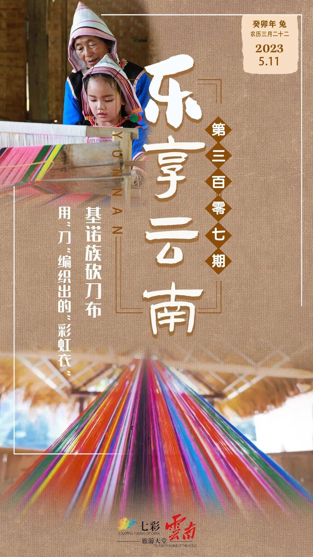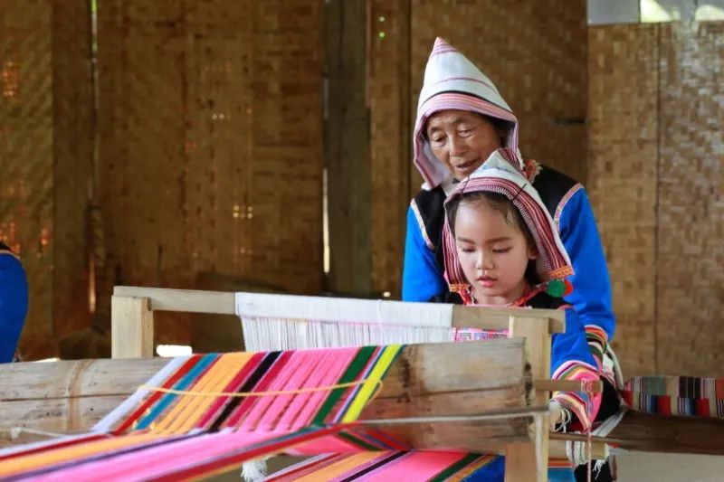 “砍刀布”是基诺族至今还保留着的独有的织布方法,也是基诺族特有的手织面料,将线固定好后利用一根木梭在线与线之间来回穿行,在棉线每一次穿梭后,再用砍刀式的木板将纬线打紧,于是就有了“砍刀布”一说。