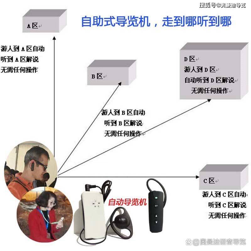 自助导览系统采用的是 RFID-2.4G 分布系统设计,自助导览机是全自动的。在个人进行参观时无需进行任何操作,每走到一讲解点附近会自动感应讲解对应音视频等内容介绍。走到任何一处讲解点信号覆盖区域都会自动感应对应音视频播放。只要在各需要讲解的区域预置 RFID 发射器,为参观者发配人手一台语音导览机即可,当游客携语音导览机进入发射器所在区域时,既能通过耳机自动感应收听对应音频内容,实现走到哪,对应讲解到哪,全自动感应无需人工操作。