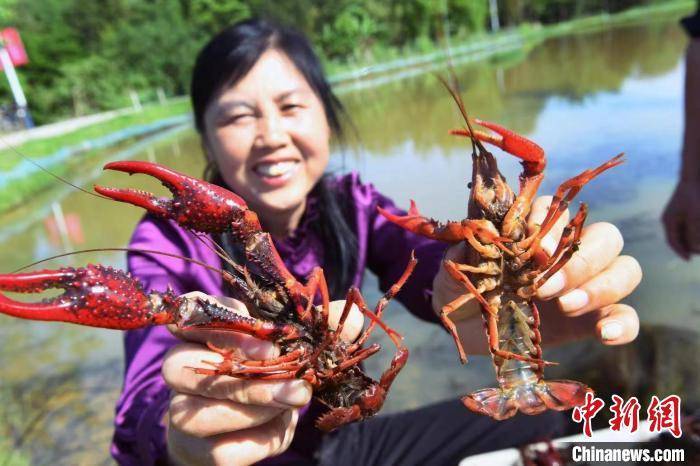 江西省赣州市南康区坪市乡虾农开心收获着自己养殖的小龙虾。 赣州市南康区委宣传部 摄