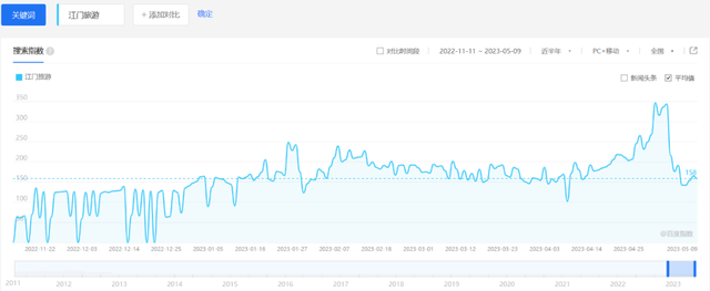 而在作为旅游城市的知名度上,江门旅游全网搜索数据也是持续向好的。以百度指数近半年以“江门旅游”为关键词的搜索指数数据看来,其搜索热度较《狂飙》开播前有显著提升,这是小众目的地整体营销推广时最愿意也是最需要看到的反馈结果。