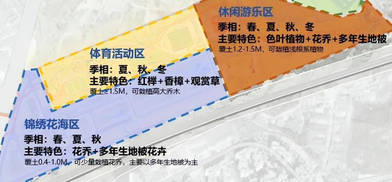 锦绣花海区以地铁蓝为主色调,下层配以多年生地被花卉,上层开花乔木组团点缀其中,打造具备沉浸式体验的上盖大地花海景观。