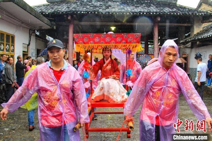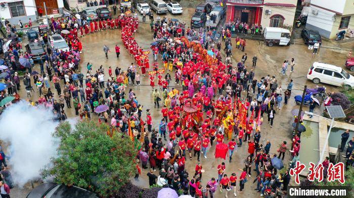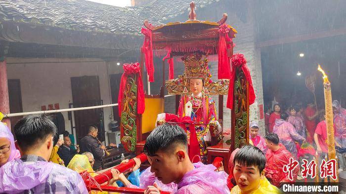 中新网桂林5月11日电(杨宗盛 许鹏 李绍芳)5月11日,广西桂林市平乐县举行华山第十届妈祖文化旅游节,当地民众用花轿抬着“妈祖”,在彩旗、花篮花扇、秧歌、排灯、龙狮队、外嫁女等10多个队伍的拥簇下沿街祈福巡游,吸引了来自福建、广东等地游客和当地民众近5万人冒雨参加本次活动。华山妈祖文化旅游节也成为当地一村一品的文化盛宴。