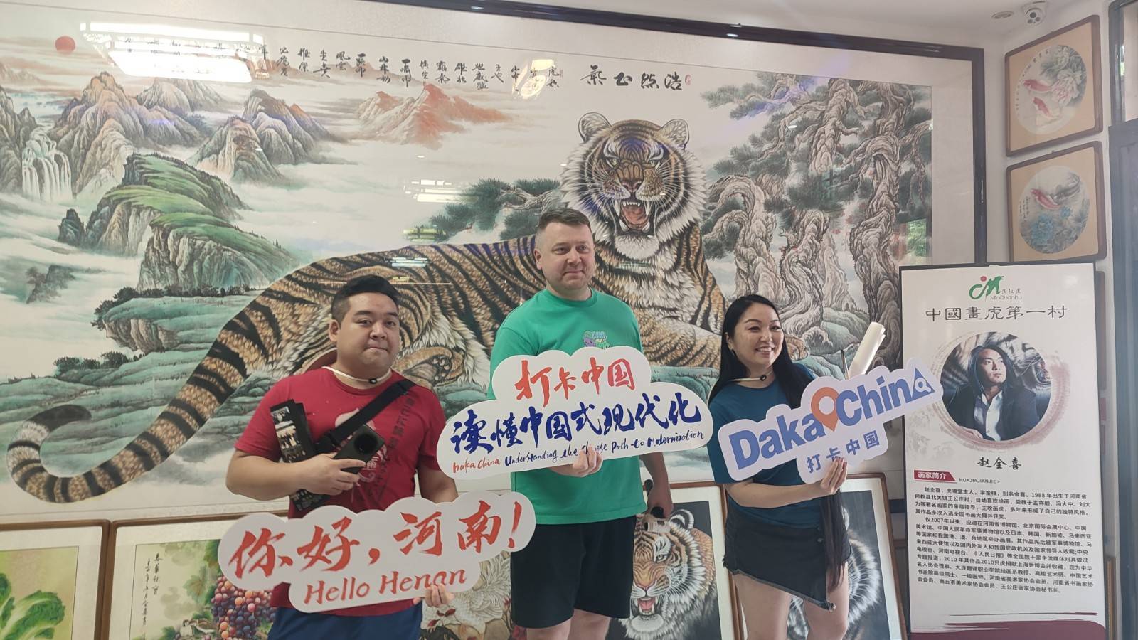 在“中国画虎第一村”王公庄村,外国网红博主一边欣赏栩栩如生的虎画作品,一边与画师交流,了解当地虎画起源、绘画技艺与独特风格,并在画师指导下体验画虎文化。
