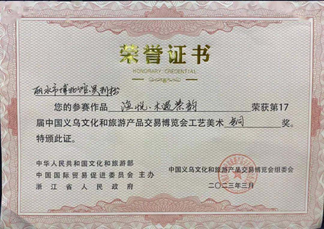 其中,由丽水市博物馆与丽水市双渔文化商贸有限公司吴利松共同研发的参展作品“渔悦·木遇茶韵”,在本次文交会 参赛的400多件参展作品中脱颖而出,荣获了第17届中国义乌文化和旅游产品交易博览会工艺美术铜奖。
