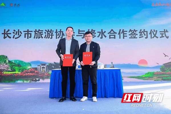 石泉在致辞中阐述了九江与长沙、修水与长沙的文化渊源及合作价值,畅谈文旅市场新动态,相邀长沙市民周末到修水“微度假”。黄欢在发言中提到,湘赣两省文化旅游发展迎来了新的机遇,合作交流进入新的“快车道”,期待长沙与修水交流互通向更高水平、更宽领域、更深层次迈进。卢海明在致辞中总结修水近年来全域旅游取得的成效,名人故里游、红色文化游、运动休闲游、温泉养生游、研学体验游等精品旅游线路正在获得市场认可,并逐渐走向成熟,正不断开发“微度假”周边产品,如房车营地、周末亲子露营、乡村休闲度假等,来修水打卡正在成为一种时尚。梁红重点推介修水全域旅游资源,并公布了针对长沙市场的299元两日游的精品线路和优惠内容。修水县旅投公司副总、修水县旅游协会副会长冷宇与长沙市旅游协会会长杨志清签订合作意向书,双方约定加强旅游开发、招商引资、宣传推广、客源互送等领域的合作。