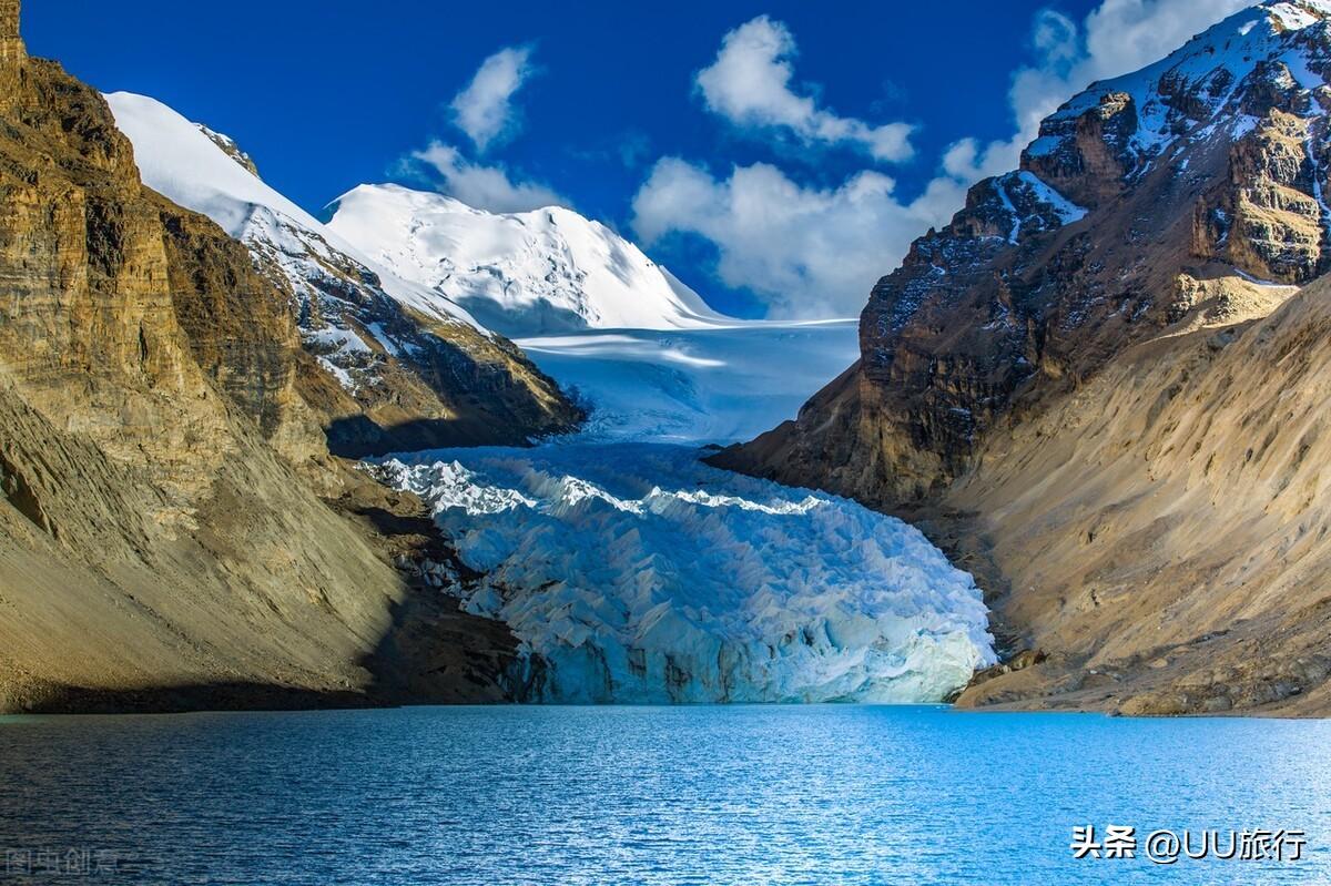 曲登尼玛冰川的全名“多吉曲登尼玛”,是“金刚石太阳塔”的意思,位于日喀则岗巴县境内。冰川从山顶沿着寸草不生的山体延伸下来,在山脚处融化成蓝色的湖水。整天呈现一条白色的冰带,向淡蓝色过渡。曲登尼玛冰川的面积不大,但是生长得足够精巧,有着“世界尽头”的形容。