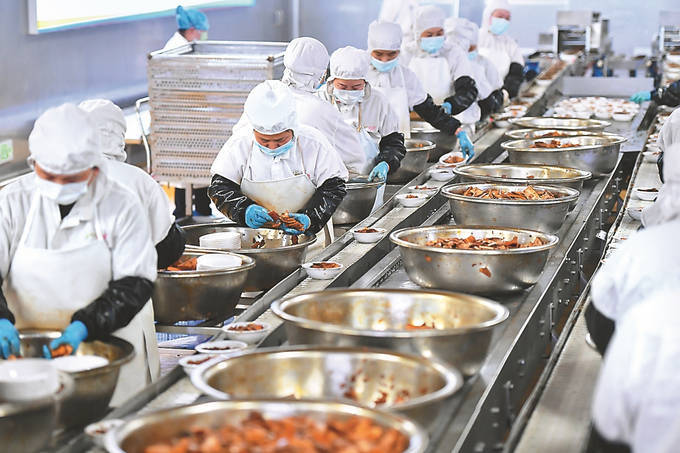 2月24日,湖南省浏阳市省级农业科技园区一家预制菜企业工作人员在生产流水线上作业。 新华社发