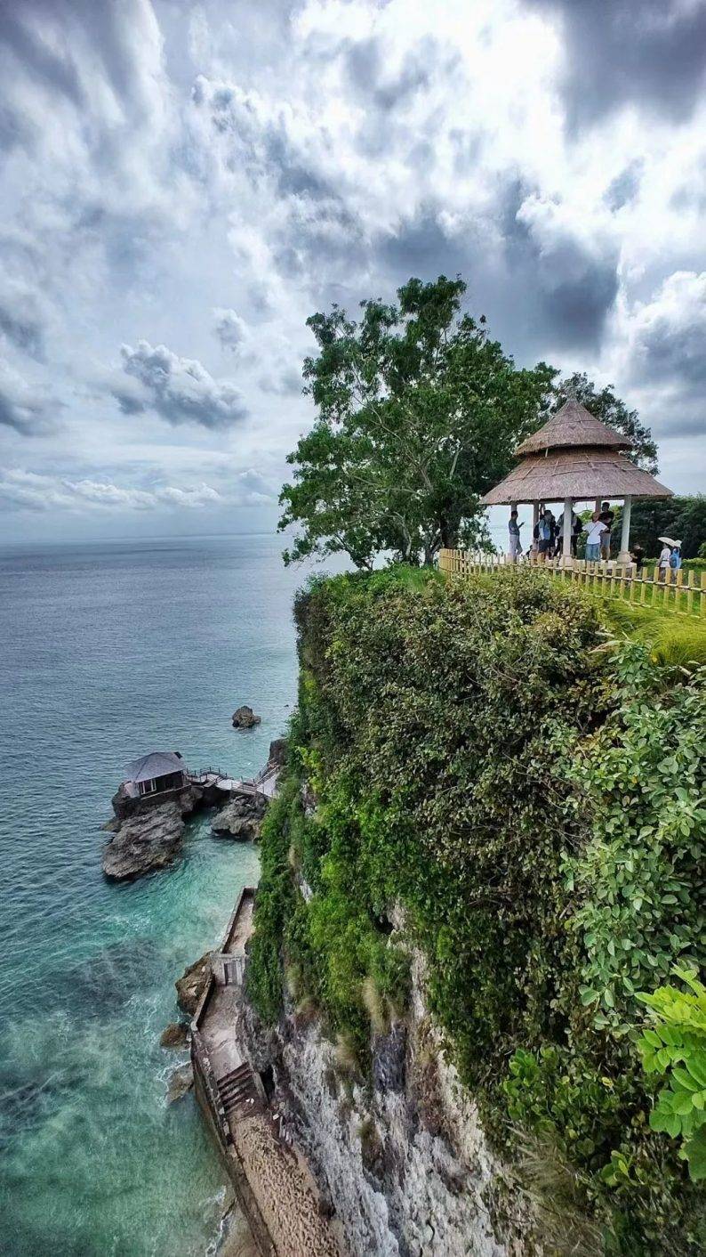 它轻巧地浮于悬崖水岸,不仅可全景欣赏浩瀚海景,阳光透过错落的木栅围栏,斑驳地散落一地光影,散发出唯美又曼妙的光影魔术。坐落于100米高的峭壁之上,其设计灵感及建筑形式均最大程度的展现了巴厘岛的自然生态。