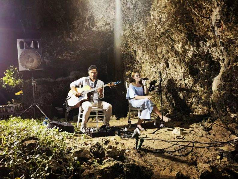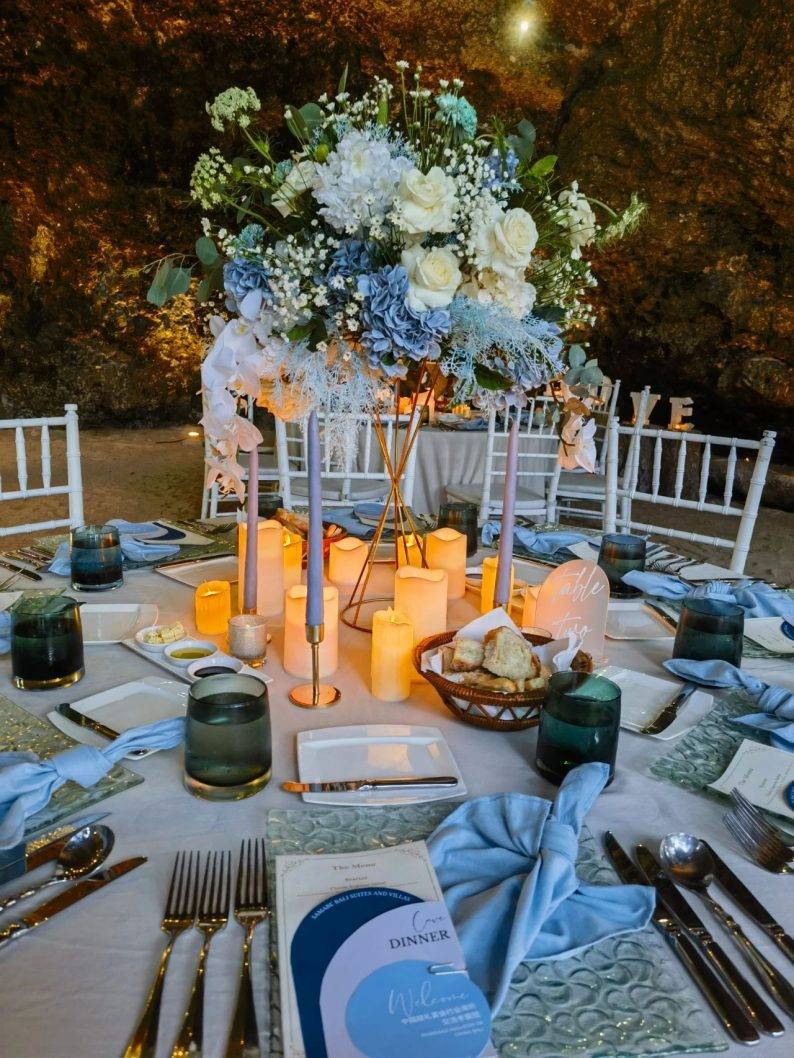 酒店按婚礼宴会标准流程请当地婚庆公司实景布置答谢晚宴,并请乐队与歌手助兴,岩洞特别的环境,为考察团带来的与众不同的婚宴氛围体验。