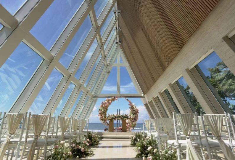 康莱德酒店是一家豪华的海滨度假酒店。其中的港丽无限教堂呈“人”字形,是个非常独特浪漫的婚礼之地,设计暗含两人相互扶持之义,教堂前的通道长22英尺,意味着两人将携手共度此生。通透的设计为纯洁及完美主义者而设,高雅和别致的设计,呈现了当代艺术美感。