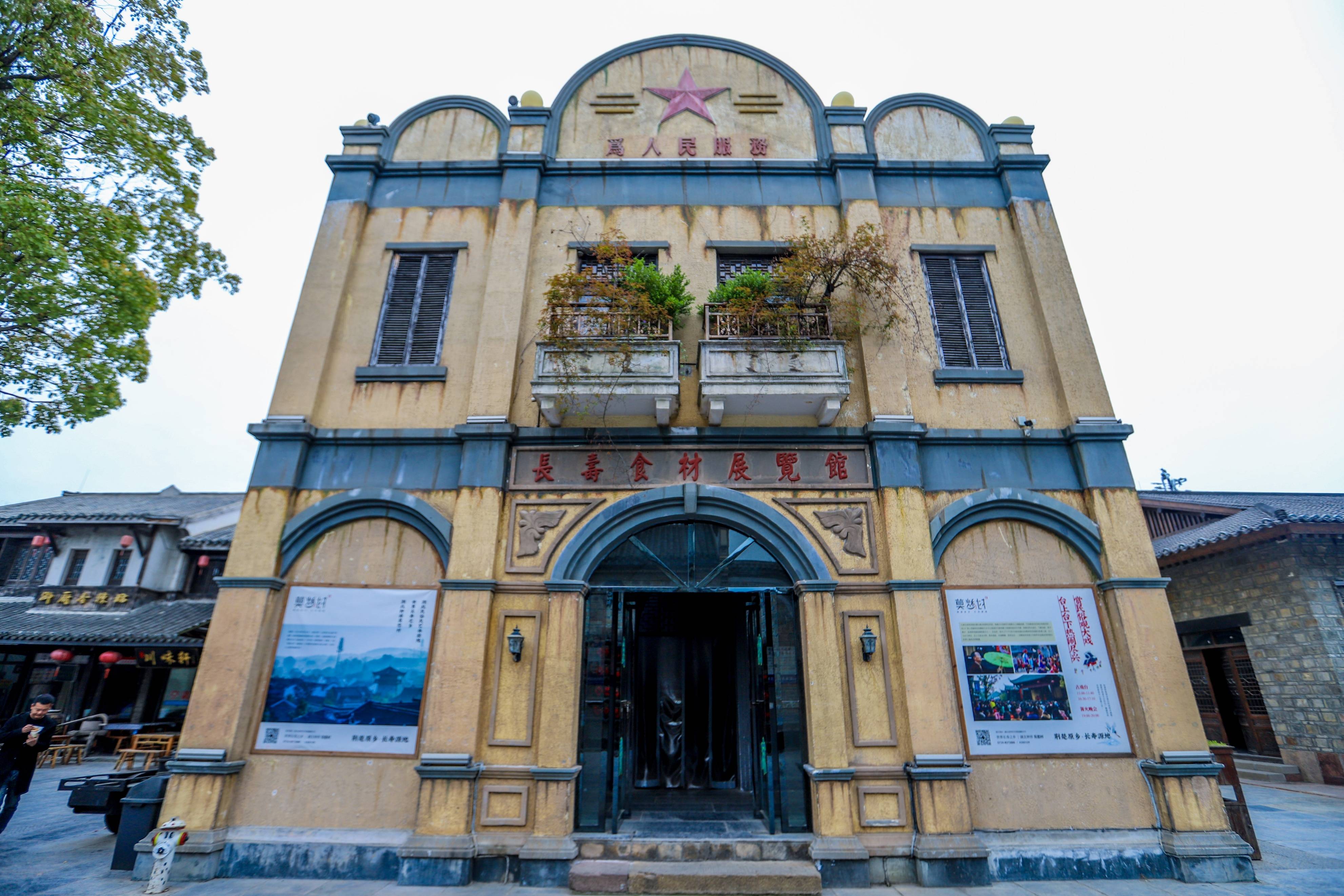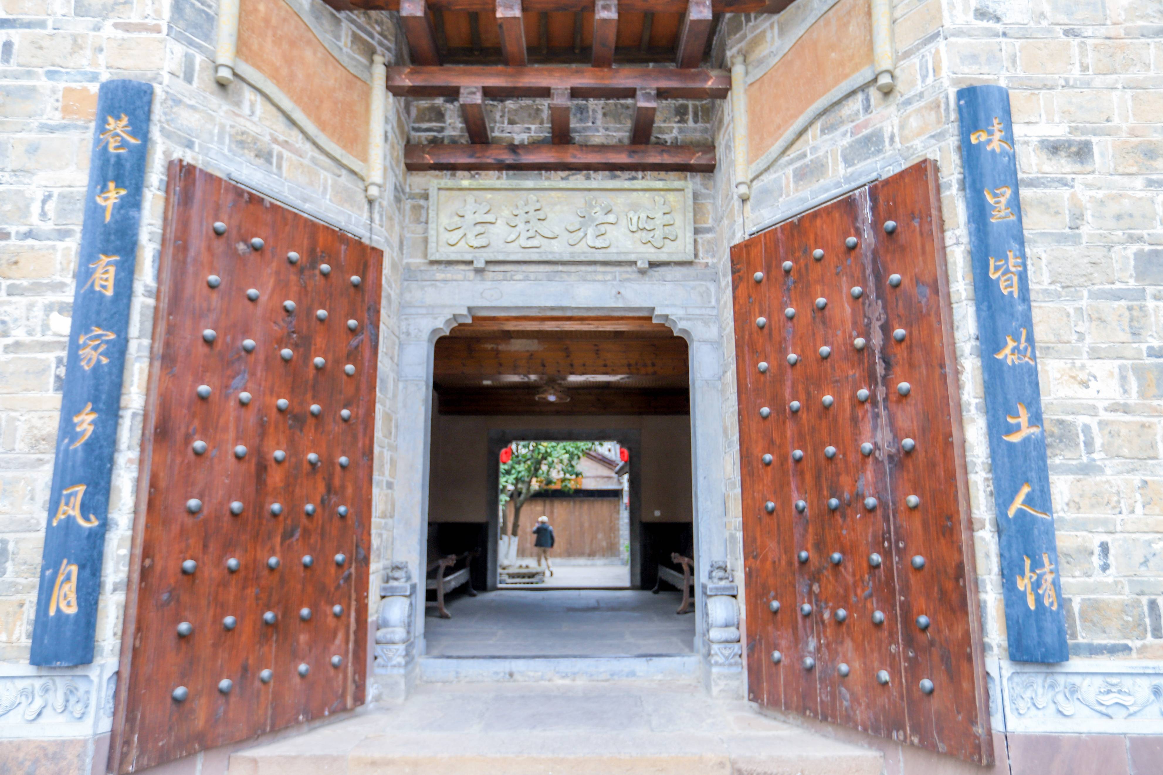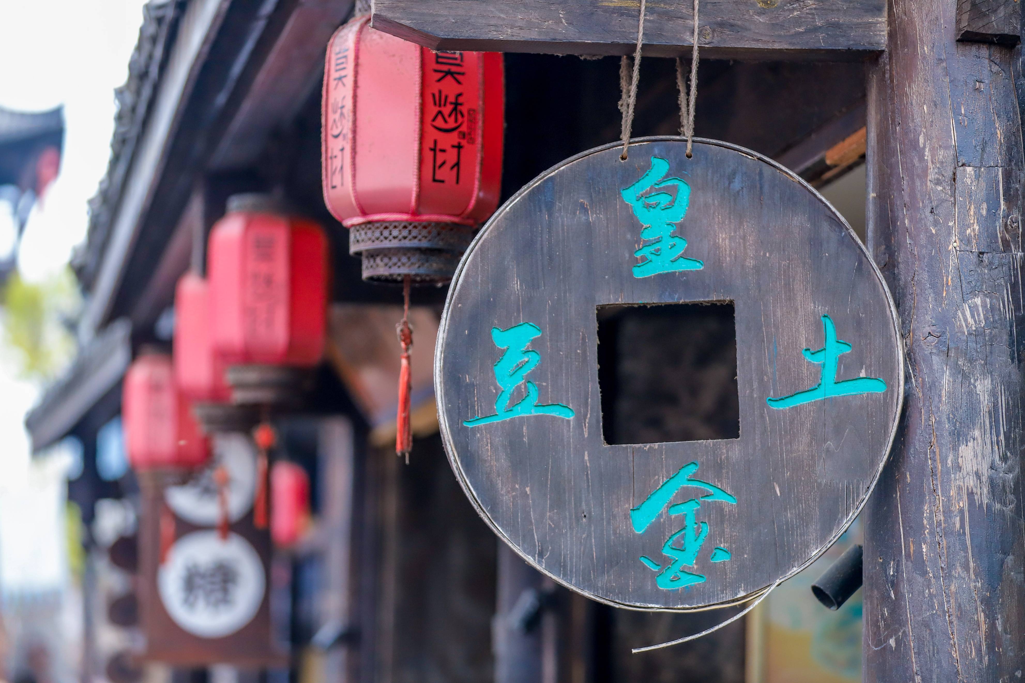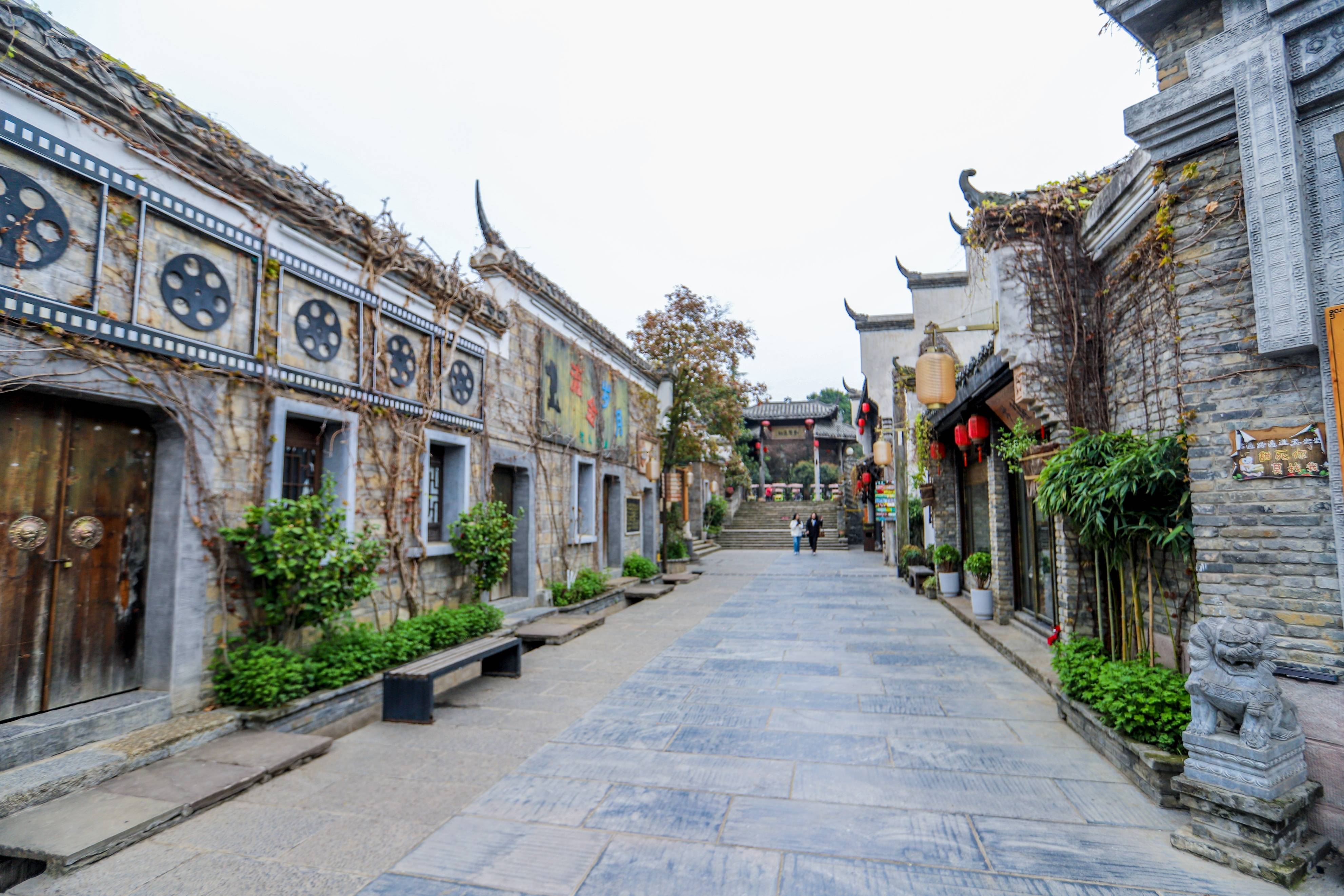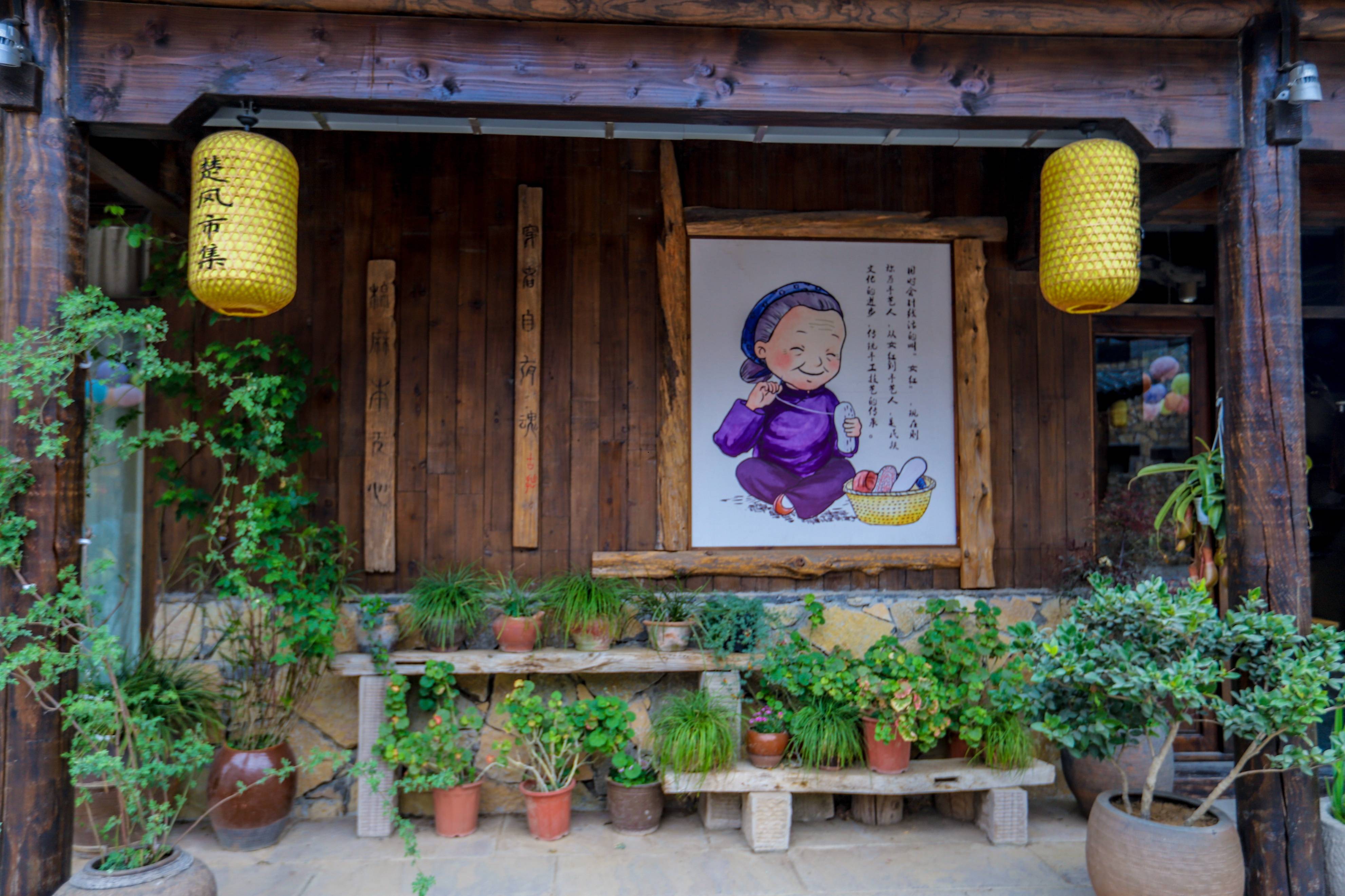 在每家店铺前都挂着同样风格的红色招牌和灯笼,屋内墙上的图案、花纹由民间老艺人亲笔绘画,青砖上攀延着翠绿的爬山虎……