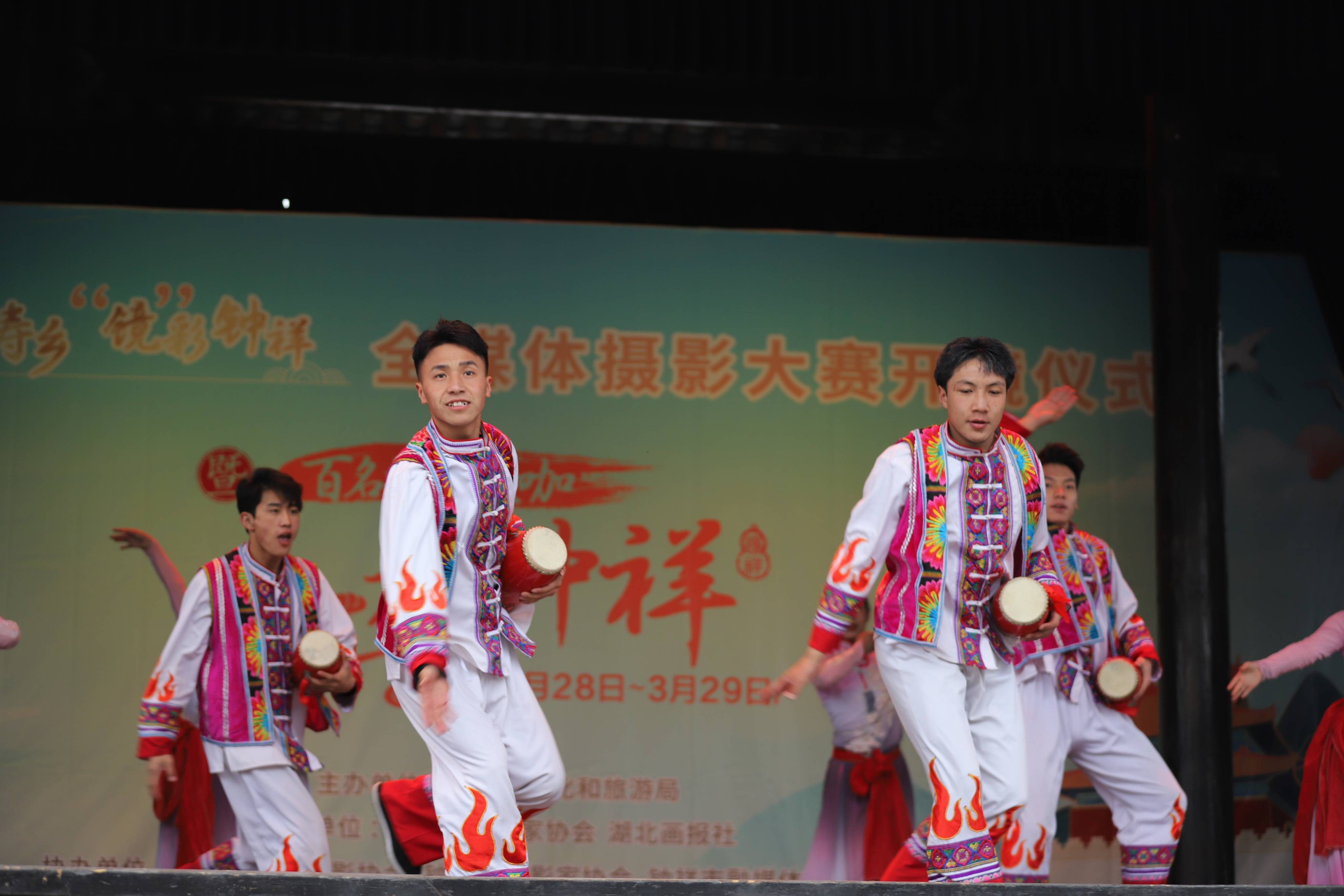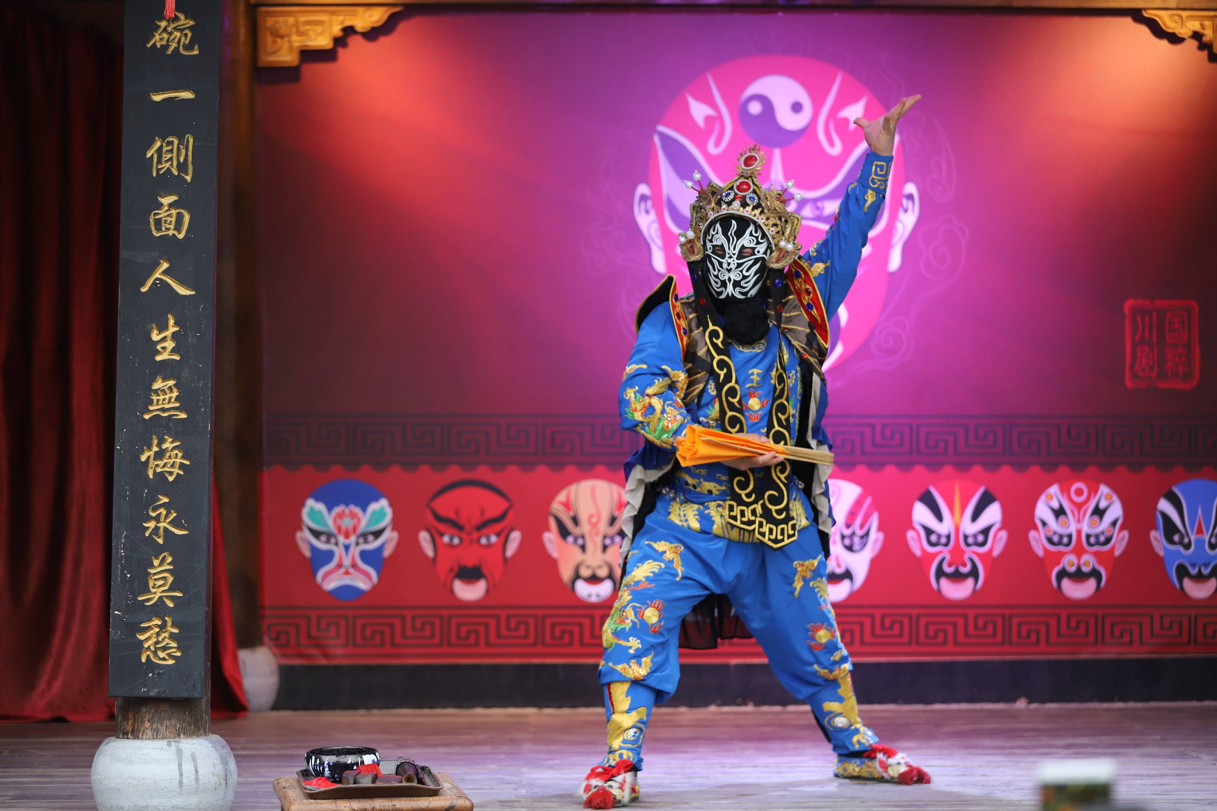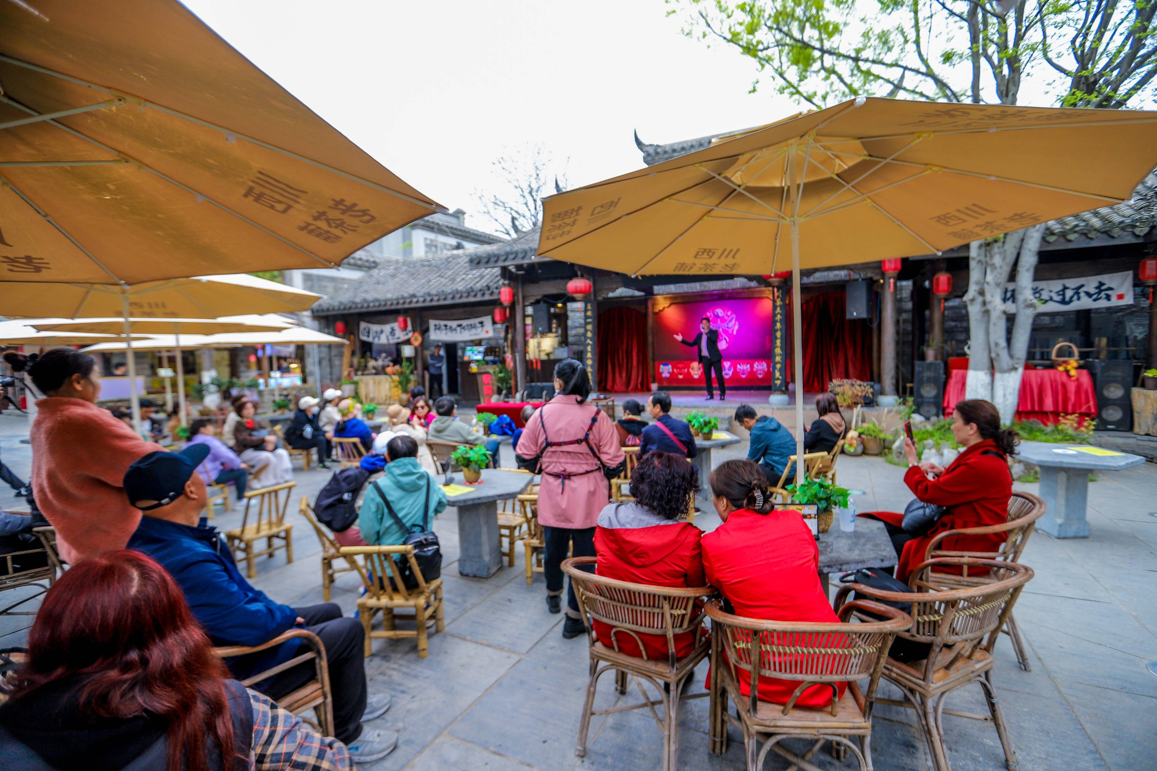 景区中间位置有一个纯木质结构的古戏楼,每天在此为游客演绎正宗的荆楚地方戏曲和民俗绝活,他们的表情兴奋,仿佛穿越回到了那个古老的时代。