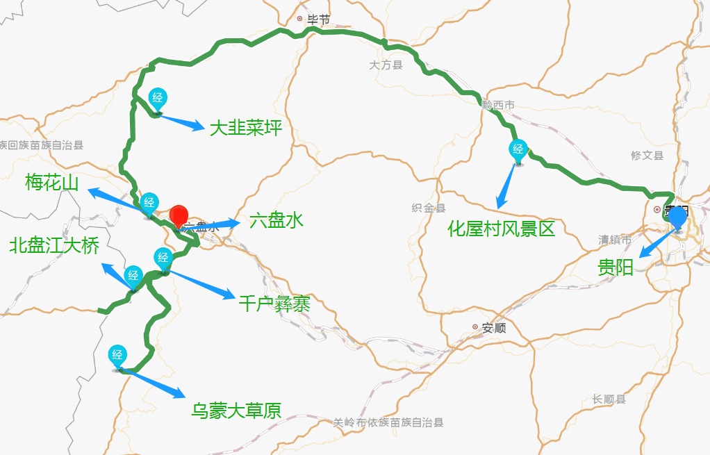 乌江源百里画廊.大韭菜坪.化屋村.乌蒙大草原.梅花山.北盘江大桥.玉舍森林公园.海坪千户彝寨.水城古镇.风池园.天上花海.天龙屯堡.三线建设博物馆...