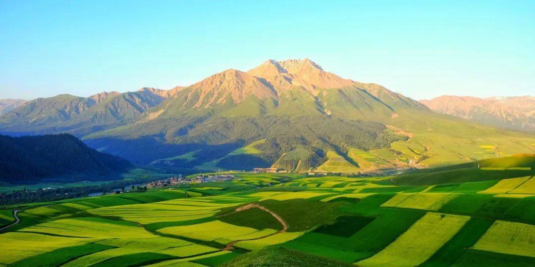 每年3、4月间,与草原相接的祁连山依旧银装素裹,而草原上却碧波万顷,马、牛、羊群点缀其中。