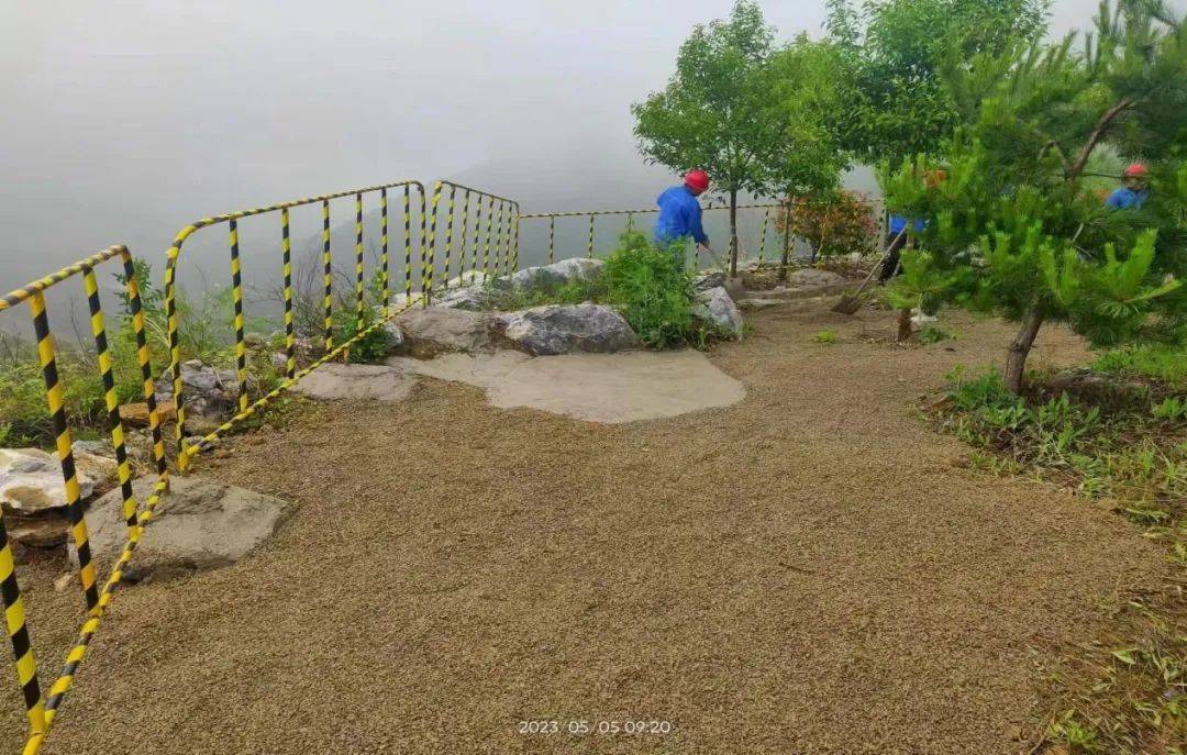 观景台位于矿山西南角,站在上面可以俯瞰矿区全貌,是迎接检查的第一站。为了提高观景台的安全性和观赏性,大家首先对观景台边沿进行了处理,清理浮石和杂草等障碍物,并设置防护栏。同时,对观景台路面及周围树木进行了修整,使其更加美观。经过一天的努力,现场环境焕然一新。