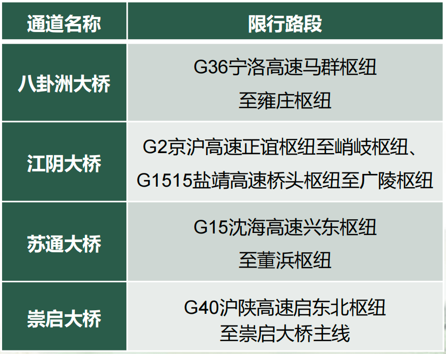 清明期间,八卦洲大桥、江阴大桥、苏通大桥、崇启大桥继续实施黄牌货车限时错峰出行政策,限行时段为4月4日12时-4月5日22时,限行路段如图所示。