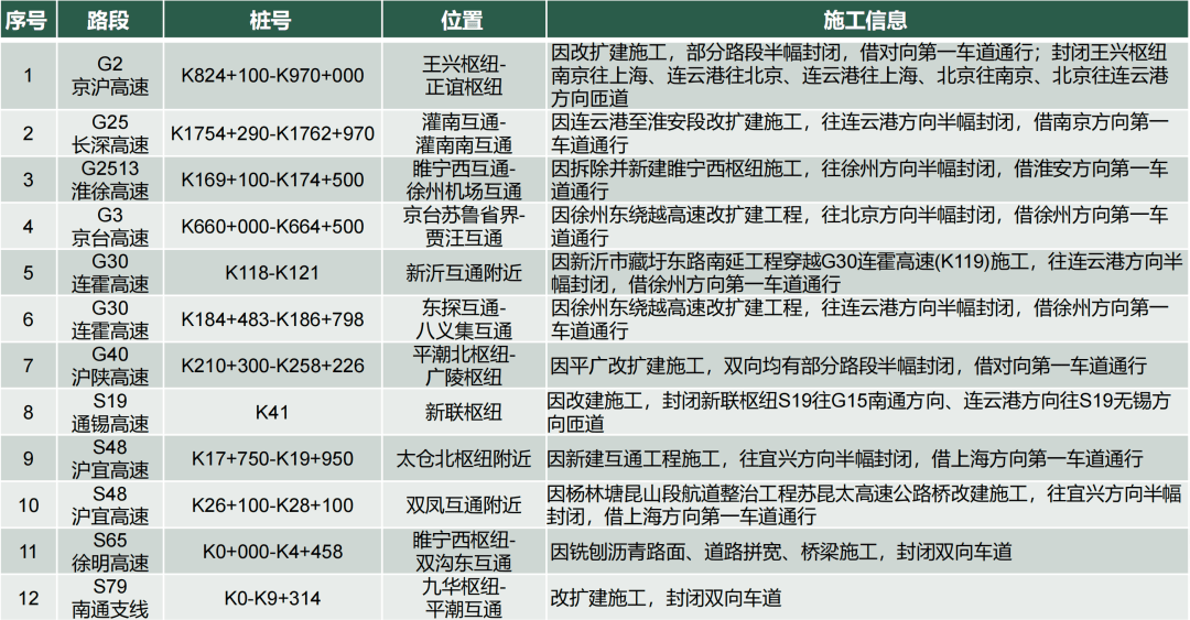 清明期间,省内有G2京沪高速、G40沪陕高速等12处高速公路施工路段、节点,请注现场交通标志提示!