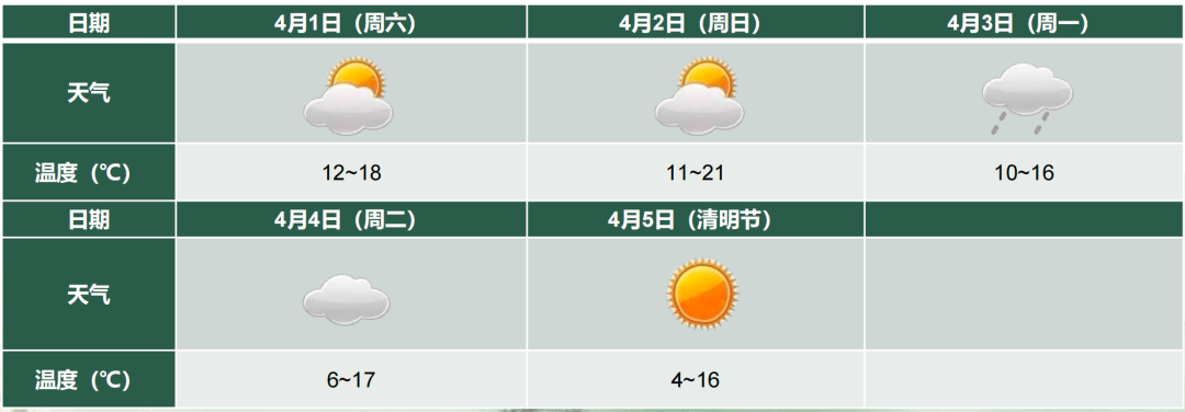 根据国务院安排,2023年清明节放假时间为2023年4月5日。根据气象台发布信息,预计全省大部分地区以多云为主,气温基本在4~20°C之间,温差较大,外出注意保暖。