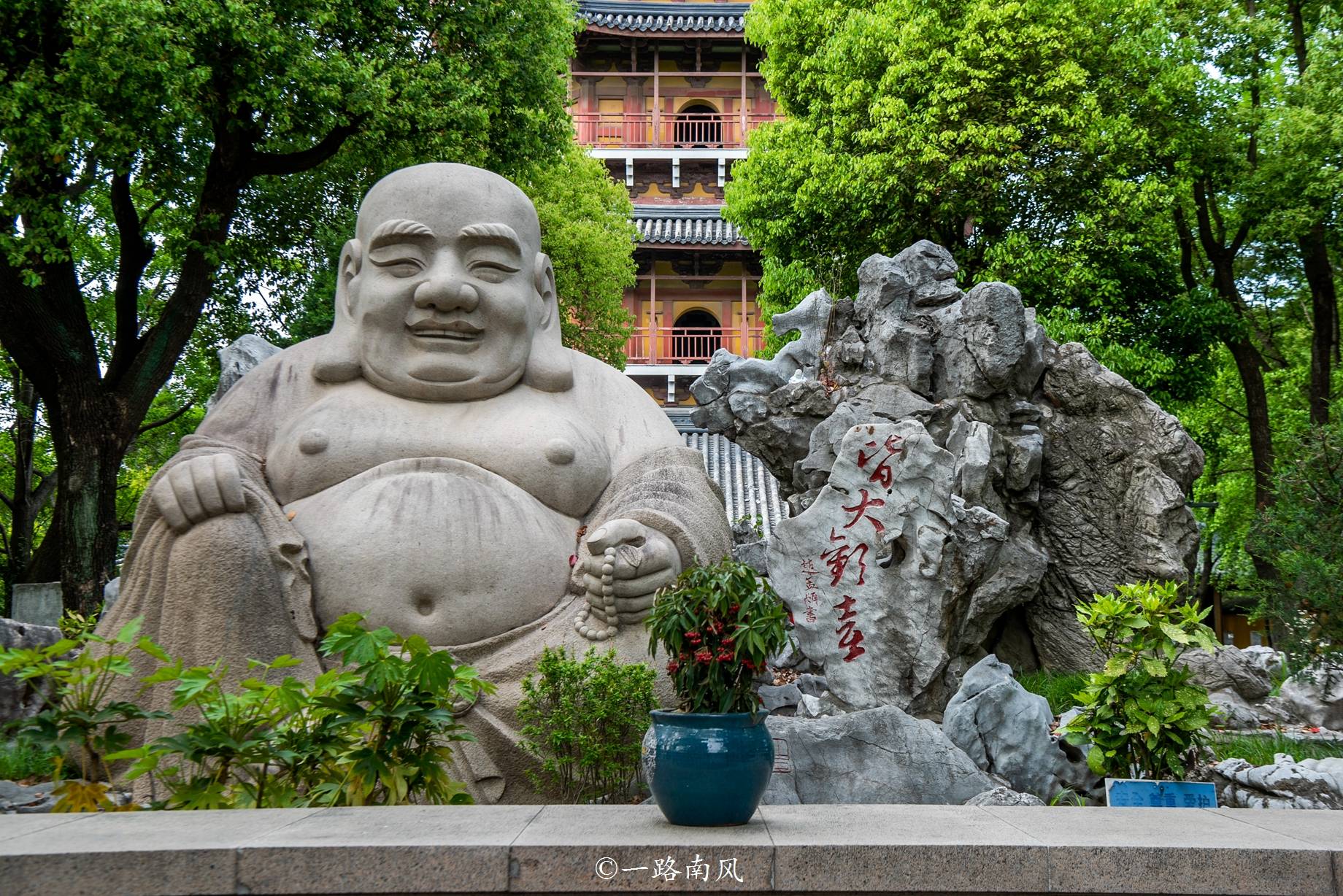 这是一座相对迷你的园林式寺庙,迎面看到的是笑态可掬的弥勒佛,旁边是一座假山,绕到弥勒佛背后,发现有一尊韦陀的站像,这个位置相当于其他汉传佛寺的天王殿。露天形式呈现的弥勒佛和韦陀造像在我国极为罕见。