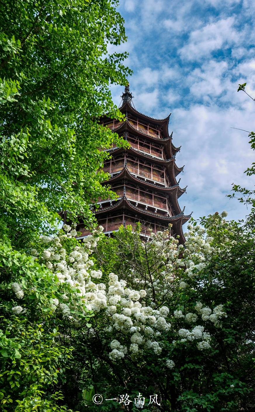 这种枫叶在春天和秋天变成红色,衬托雄伟典雅的宝塔,特别有意境。