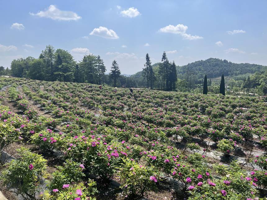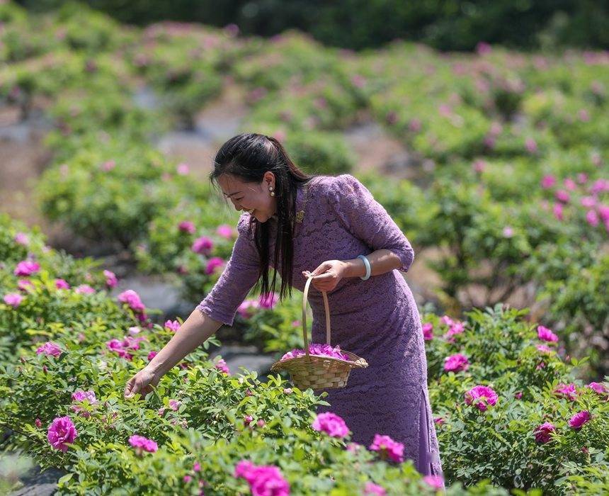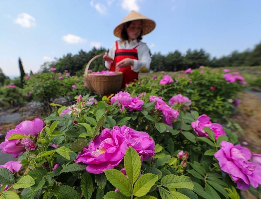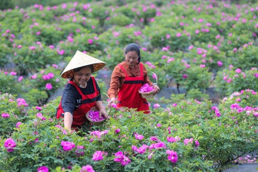 忙碌的工人们正在将采摘的玫瑰花放进竹篓里,采摘来的玫瑰花进行分拣加工,花瓣可制成果酱,用作月饼、汤圆等食品的馅料,花朵可烘干制成玫瑰花茶,加工后的花酱以及干花等产品再由收购公司统一收购后销往全国各地制作成玫瑰紫酒、玫瑰花茶、玫瑰纯露等深加工产品,销往全国各地。