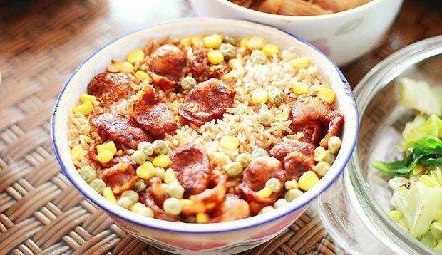 将香肠切成小块状,与米饭一同放入热锅中拌炒,香肠可让炒饭油亮又提香。