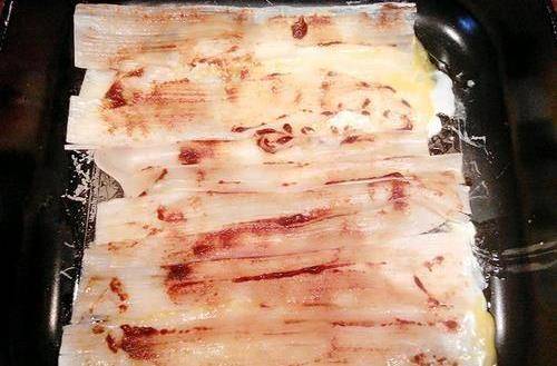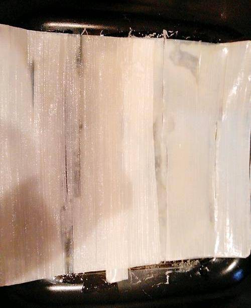 2、找个平底锅,我用的是四方锅,锅里留底油摸均匀,放入两张冷面煎软