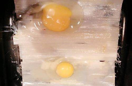 3、冷面里各打入一颗鸡蛋,铺均匀,然后翻面