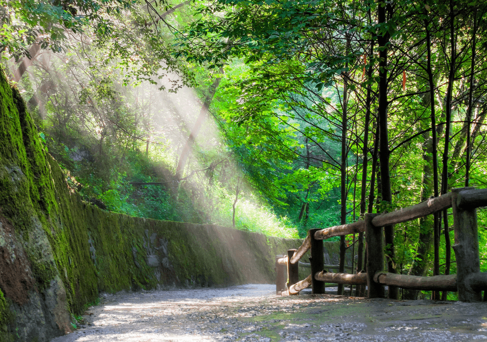 尔玛古道两旁是青翠葱茏的高大树木,一条弯曲的石板路从脚下延伸至林间深处,行走其间,满树的新绿,满目的净爽。空气中饱含负氧离子,在呼吸之间洗涤着身心。