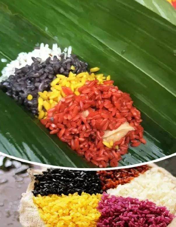 将五种色彩的糯米分别加入一点,有时也加入山猪肉、鹿肉等野味,经芭蕉叶一包,煮熟即可食用。