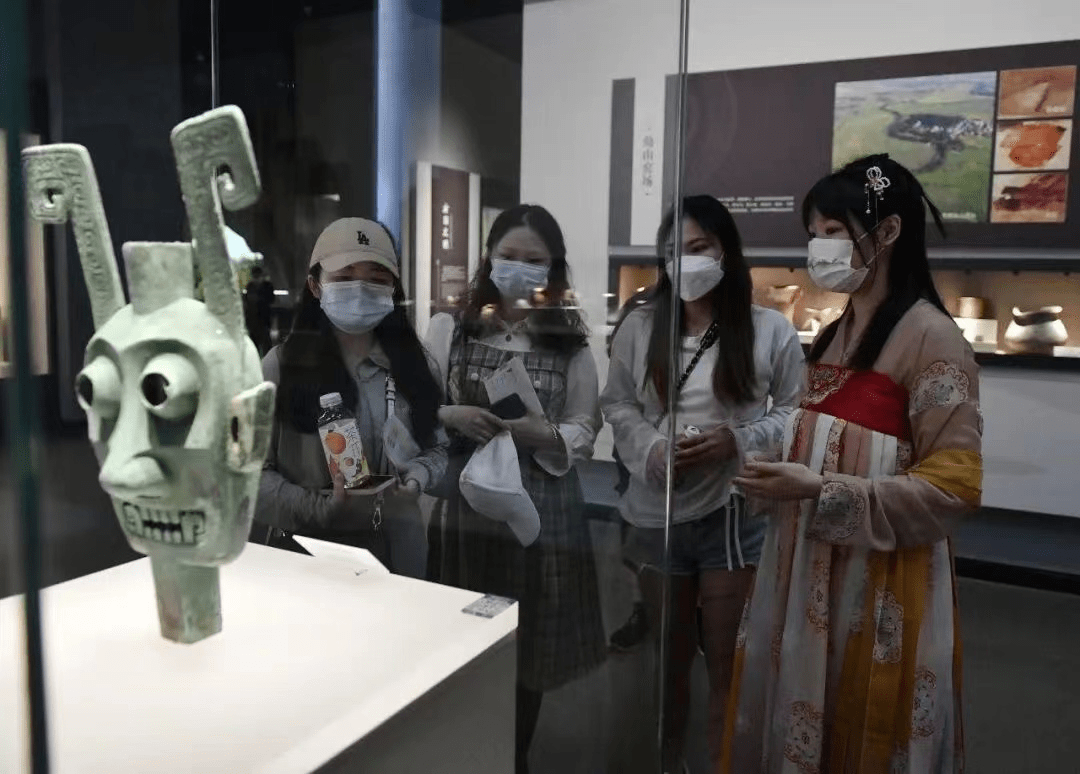 游客打卡江西省博物馆文物——商代双面神人青铜头像(图片来源:江西省博物馆公众号)