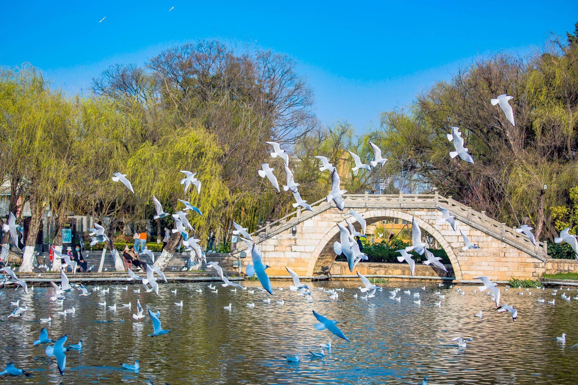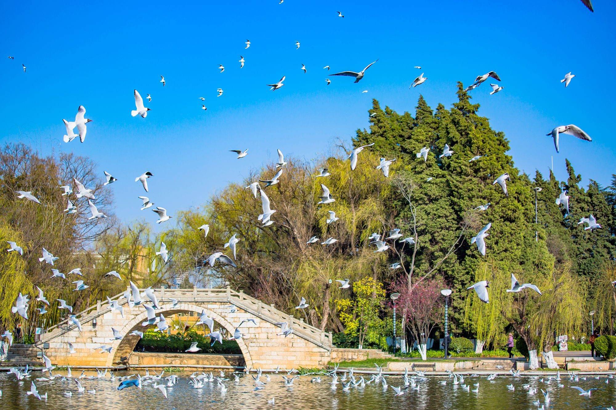 四季如春的昆明,适宜人们居住,也适合候鸟前来避冬。走在公园里,处处可见白色的水鸟,如主人般在湖水中觅食漫游,在小路上徜徉晒太阳。