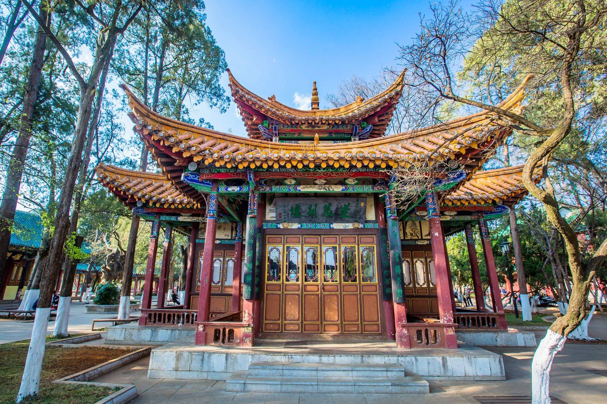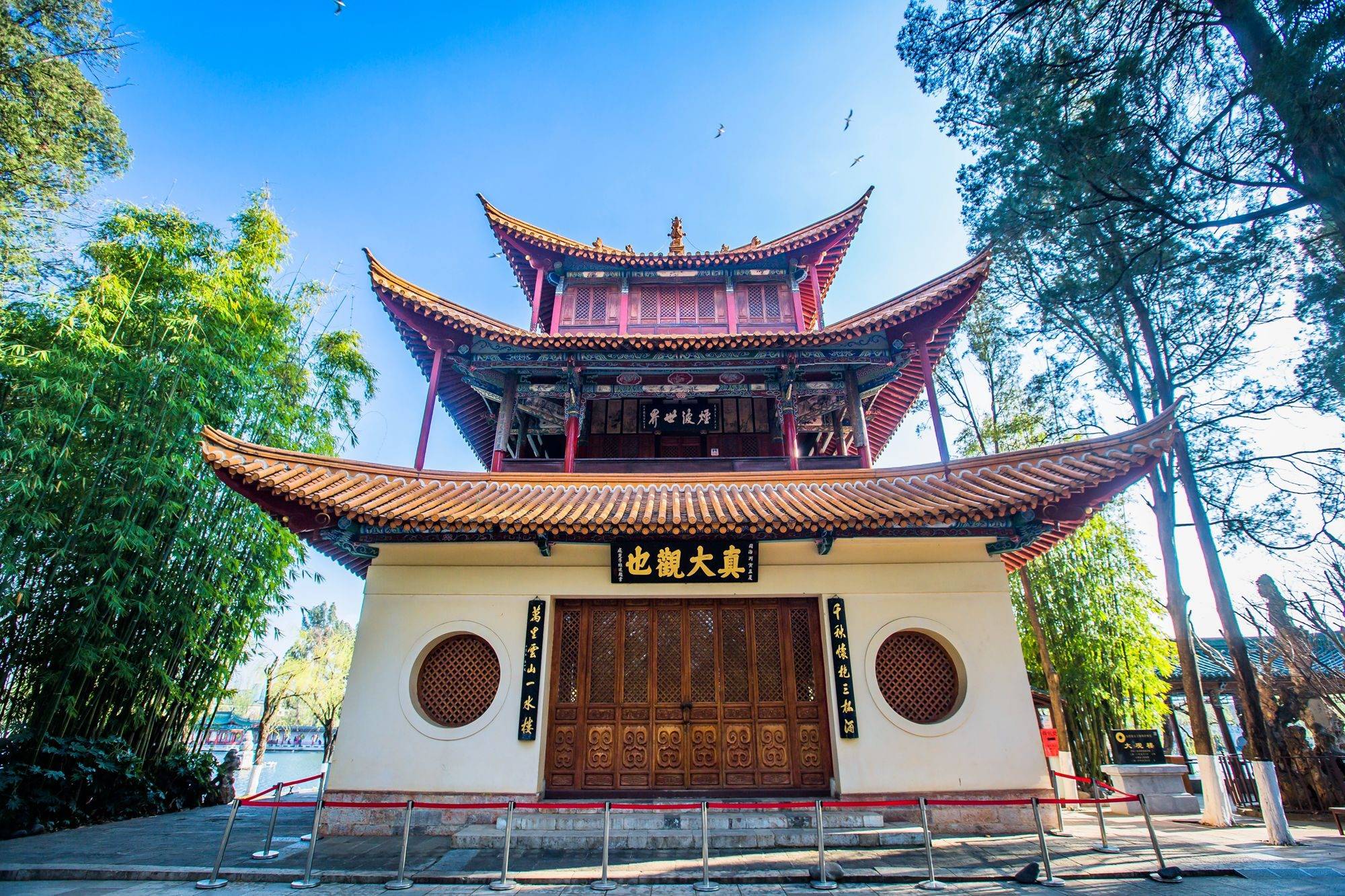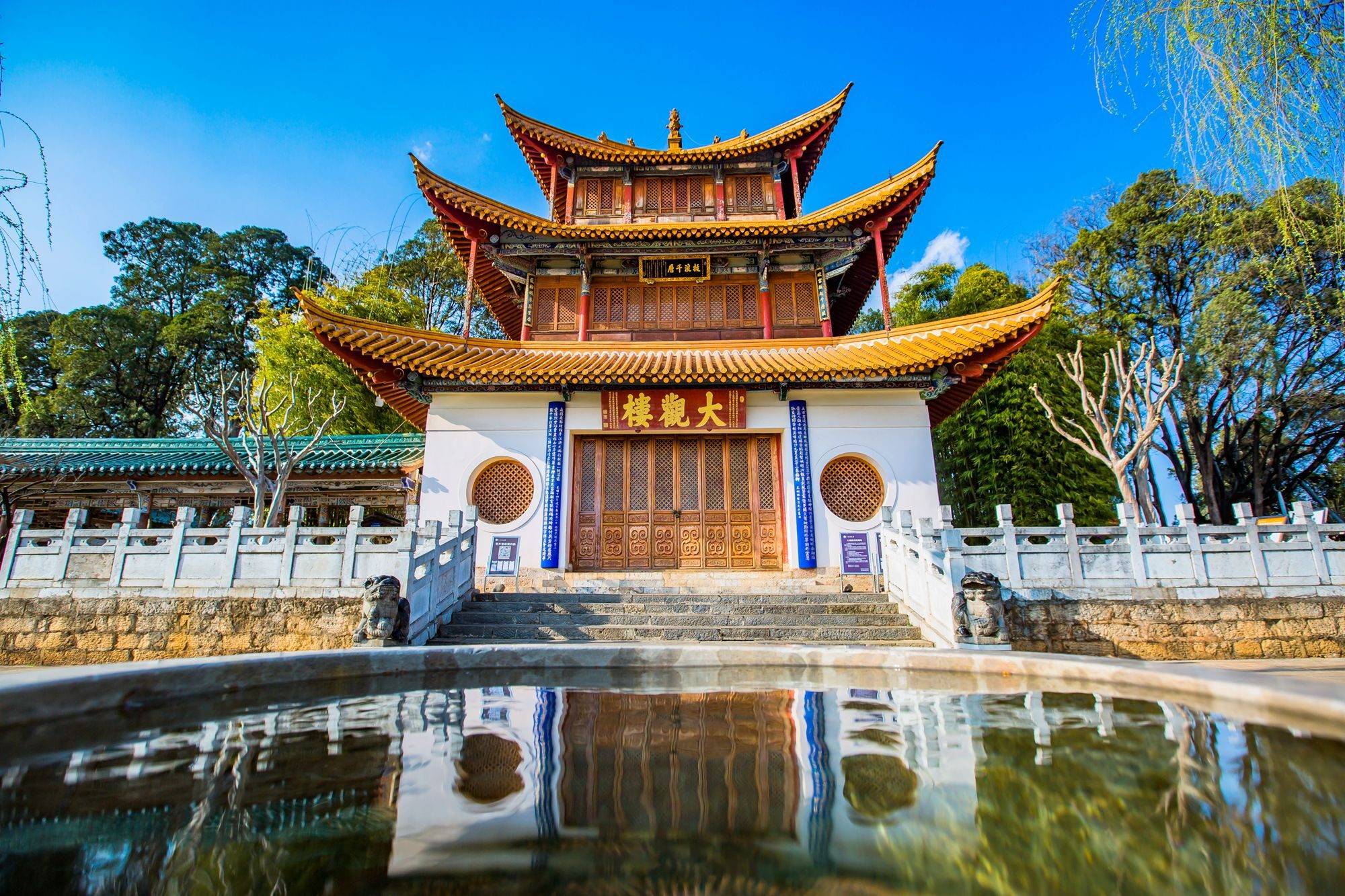 大观楼四周的建筑都为清时特色,雕梁画栋,明晃晃的阳光从黄色琉璃瓦上铺陈下来,在蓝天的映衬下格外夺目耀眼,让原本略显沧桑的建筑也多了几分华美。