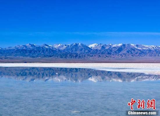 高原初夏,茶卡盐湖镶嵌在雪山草地间,盐湖水域宽广,银波粼粼,蓝天白云、雪山映入湖中,如诗如画。图为茶卡盐湖的雪山映湖。王生荣 摄