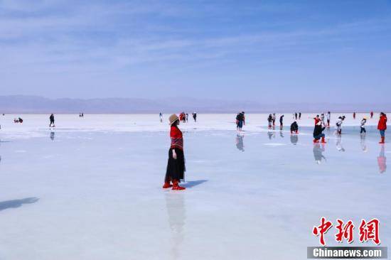 游客置身于盐的世界,漫步湖面仿佛行走在云端之上,令人流连忘返。图为洁白无垠的茶卡盐湖迎来游客打卡。王生荣 摄