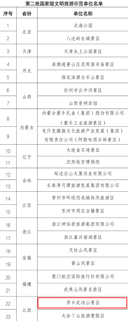 央广网南昌5月12日消息(记者邓玉玲)5月8日,根据《文化和旅游部办公厅关于开展〈文明旅游示范单位要求与评价〉(LB/T075-2019)实施工作的通知》,全国旅游标准化技术委员会认定,66家单位为第二批国家级文明旅游示范单位(包括2021年因疫情原因未开展实地评定的9家单位和2022年申报的57家单位)。其中,萍乡武功山景区入选。