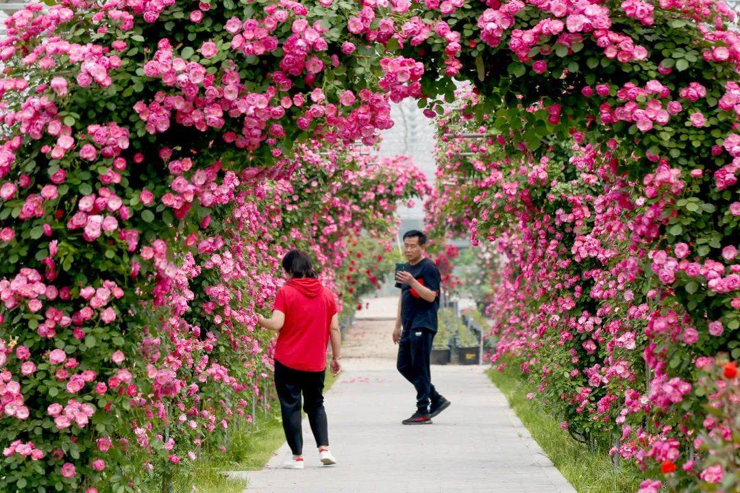 上午10点半,在大兴区纳波湾月季文化产业园温室区域,可以看到月季花墙、月季盆景、树状月季、月季花田……花团锦簇、花香四溢。游客们手中的手机、相机快门声不绝于耳。