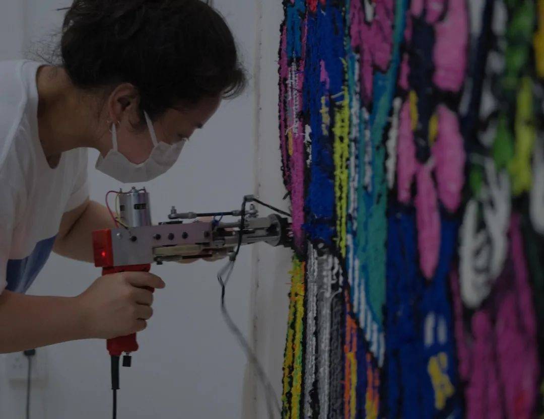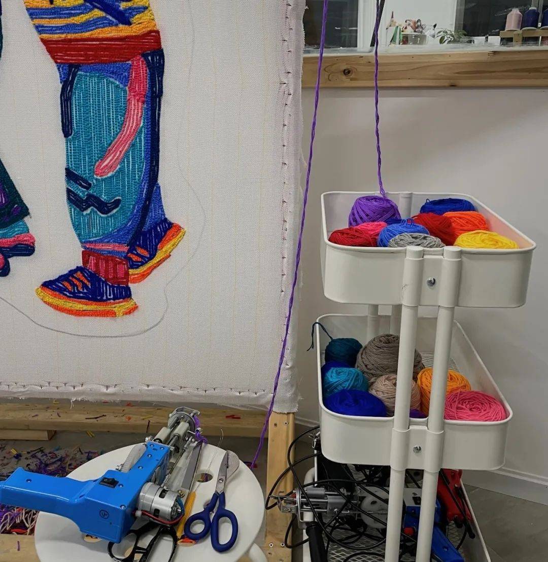 走几步台阶,是大大的工作室。工作间里有小5的插画作品,插画衍生品,学生们的练习作品,里间是簇绒地毯tufting 体验馆。