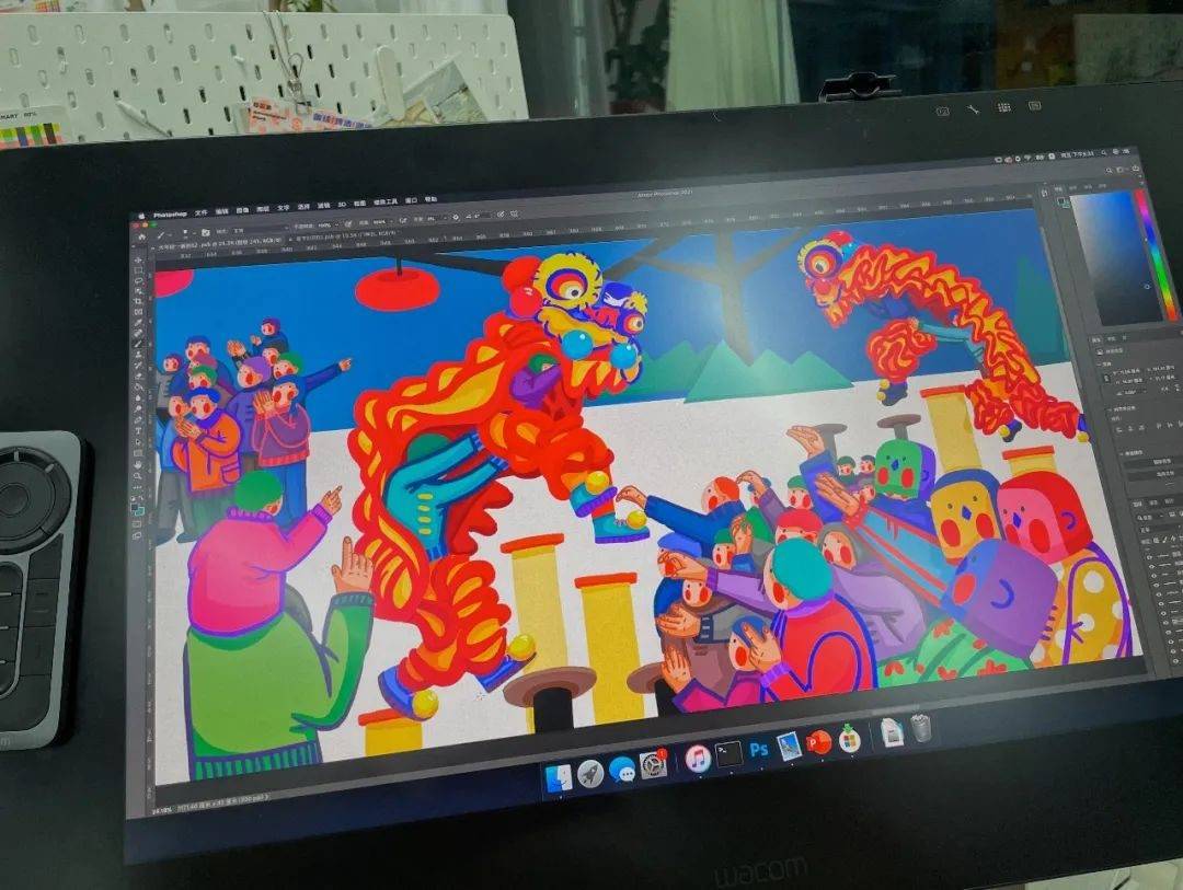 小5不太喜欢一个IP反复使用,不希望一个IP跟她贴得太紧,所以基本上每年会创作1-2个新的IP。最具代表性的IP是60*62cm长卷《春节游园会》里的主角带头套的人。