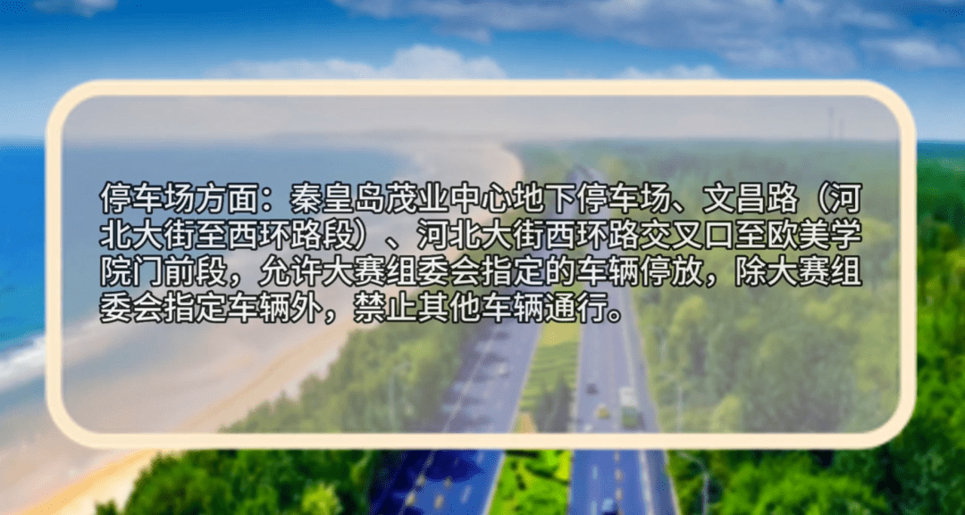 秦皇岛茂业中心地下停车场、文昌路(河北大街至西环路段)、河北大街西环路交叉口至欧美学院门前段,划定为马拉松赛专用停车场,允许大赛组委会指定的车辆停放,除大赛组委会指定车辆外,禁止其他车辆通行。