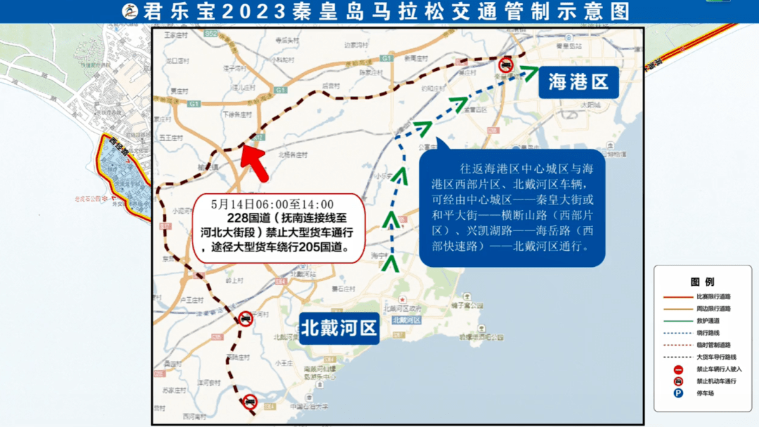 5月14日5时至14时:海港区河北大街(文龙路至西环路段)、山东堡路(西环路以南路段)、文昌路(西环路至河北大街段)、文宏路(文坛路至文昌路段)、山东堡立交桥、河滨路、岭前街、海滨路汤河立交上跨桥,北戴河区滨海大道(新河路以北路段)。