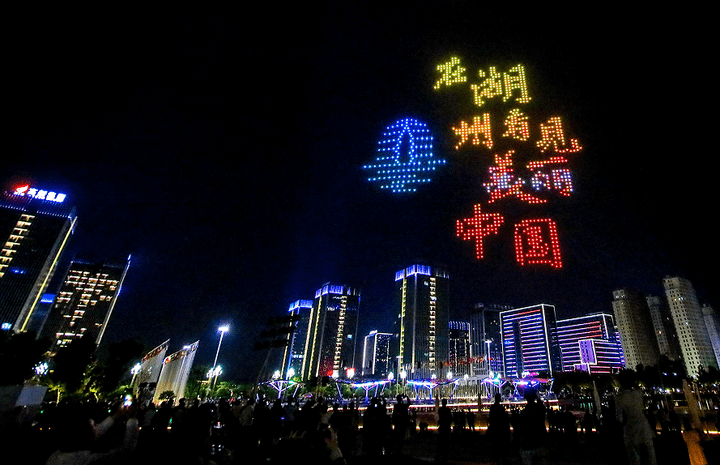 “在湖州看见美丽中国”“人有德行,如水至清”……这两天,每当夜幕降临,德清地信小镇上空2023架无人机携带七彩灯光幻化出各种文字、图案,与周边流光溢彩的国际会议中心、国际展览中心、地信小镇楼宇群交相辉映,震撼的画面让现场观众大饱眼福,也刷爆了网络。德清用这种科技感满满的方式,向外界高调展示城市形象和办会能力。