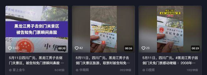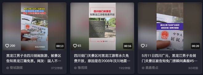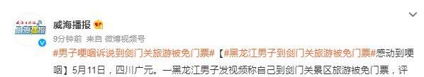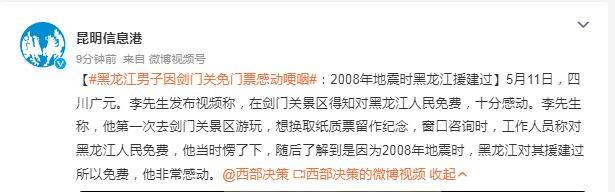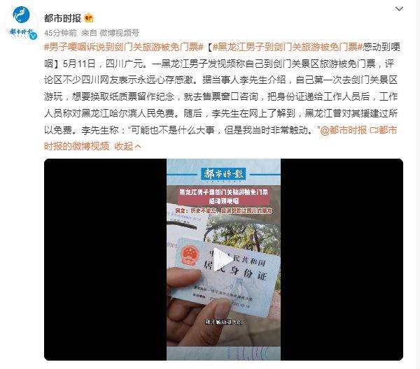 5月11日,四川广元。一黑龙江男子发视频称自己到剑门关景区旅游被免门票,评论区不少四川网友表示永远心存感激。据当事人李先生介绍,自己第一次去剑门关景区游玩,想要换取纸质票留作纪念,就去售票窗口咨询,把身份证递给工作人员后,工作人员称对黑龙江哈尔滨人民免费。随后,李先生在网上了解到,黑龙江曾对其援建过所以免费。李先生称:“可能也不是什么大事,但是我当时非常触动。”