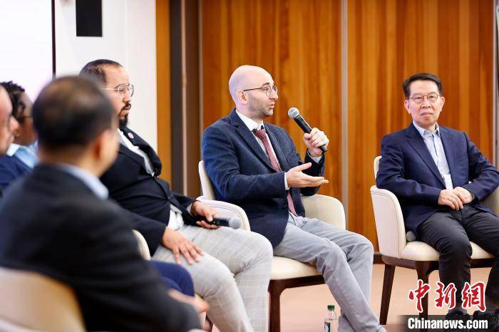 当日,意大利青年汉学学者范狄(右二)在国际中文日活动中与多国青年学者探讨乡村振兴和文明对话。 欧洲时报 王欧 摄