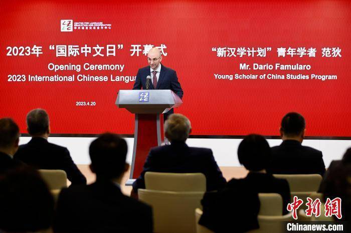 2023年3月17日,北京,意大利青年汉学学者范狄在国际中文日活动开幕式上致辞。 欧洲时报 王欧 摄