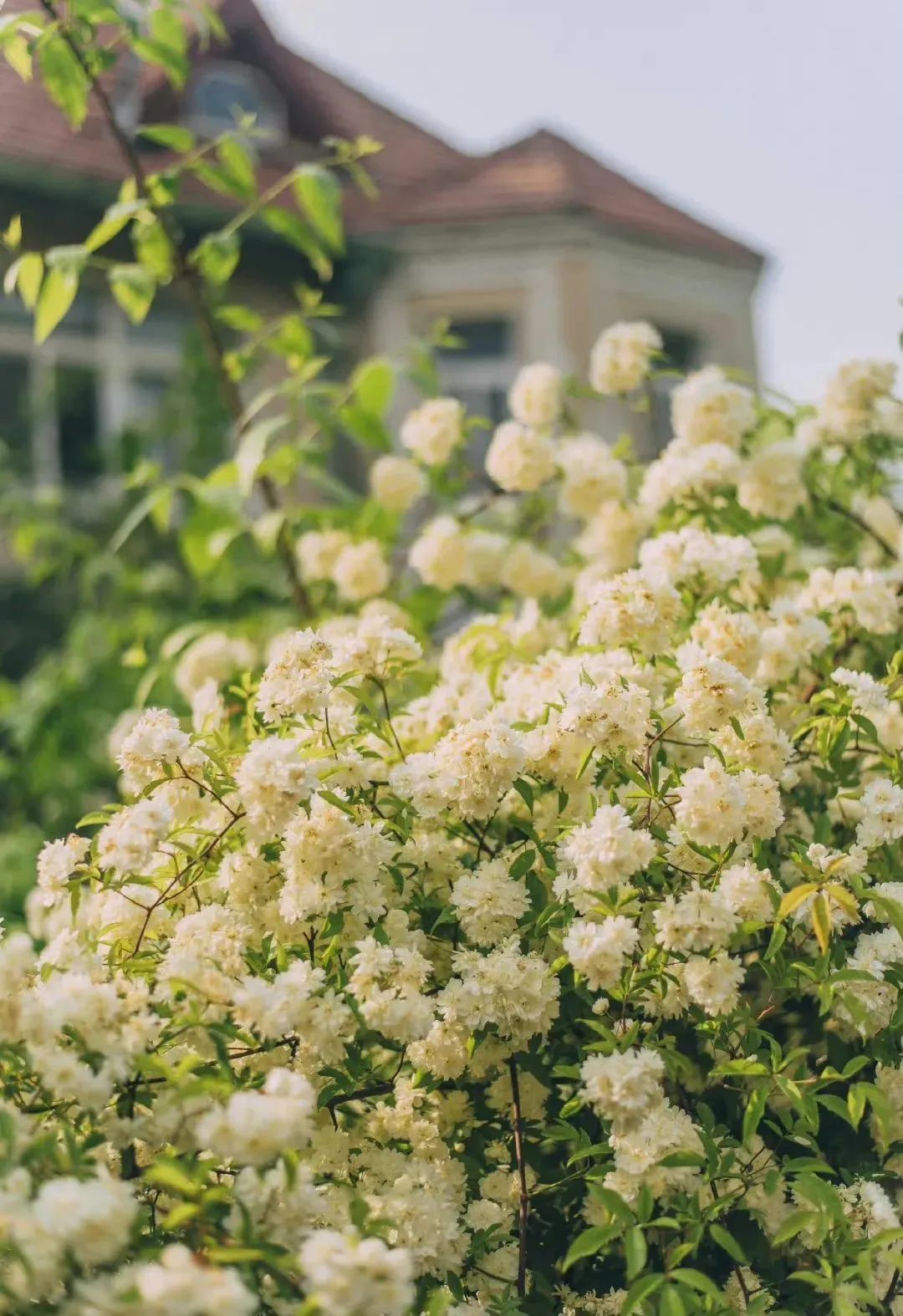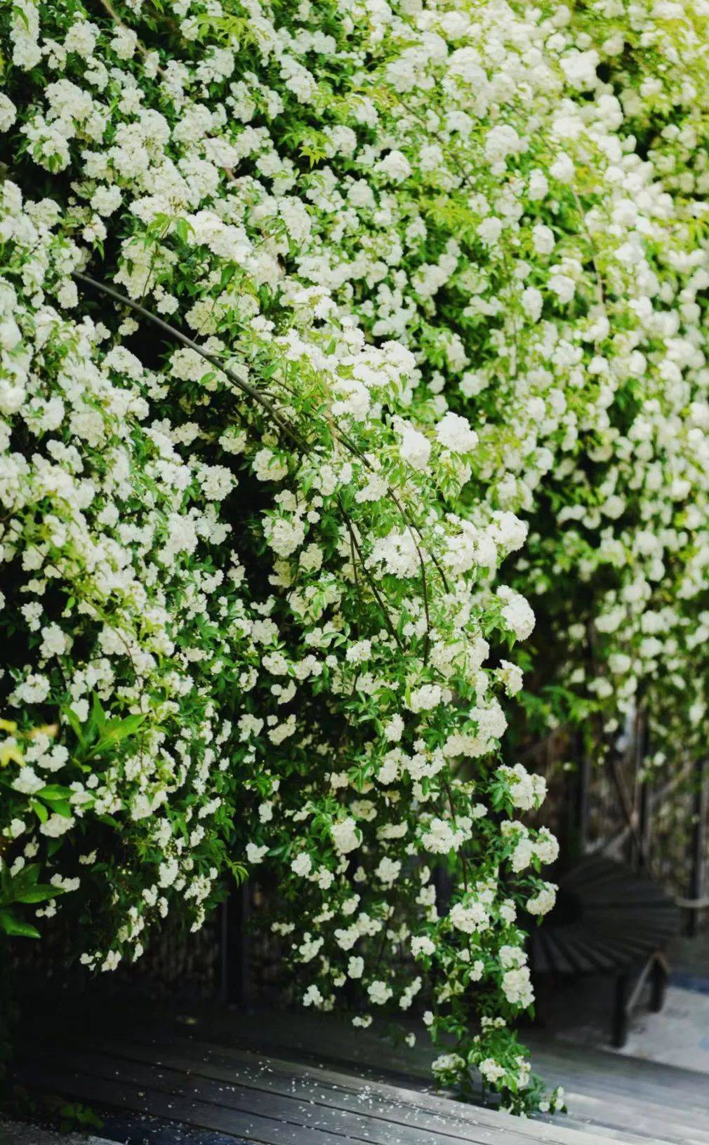 茂密的藤蔓攀缘在围墙之上,自然往下垂落,五月初,这些藤蔓上开满了白色的小花,从远处看去宛如一道绝美的花瀑一泻而下,满眼繁花,清香扑鼻。