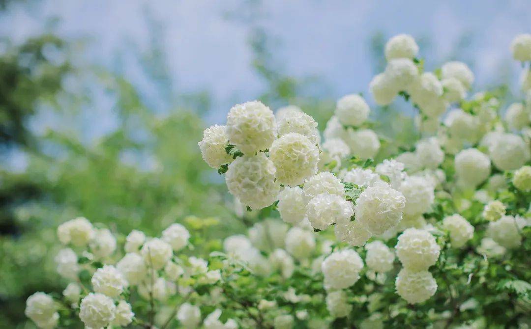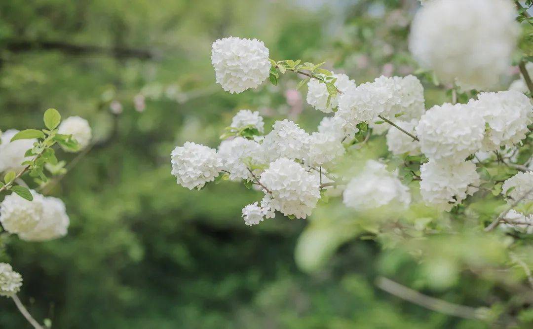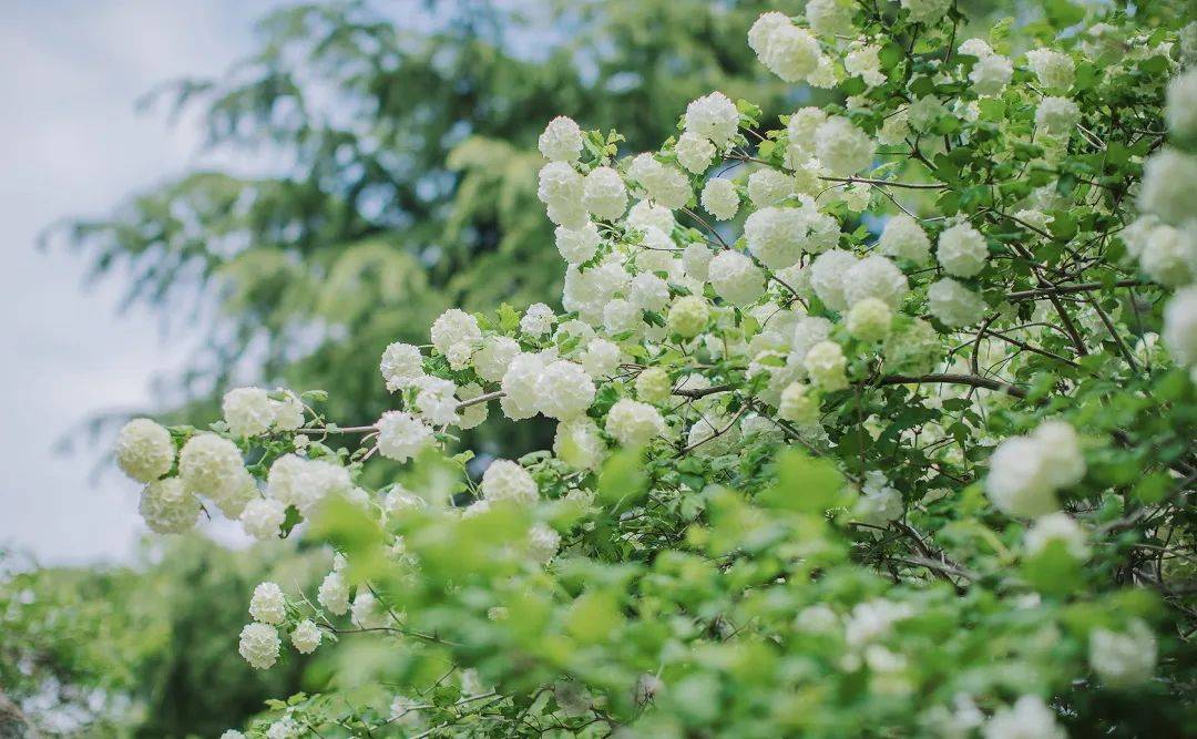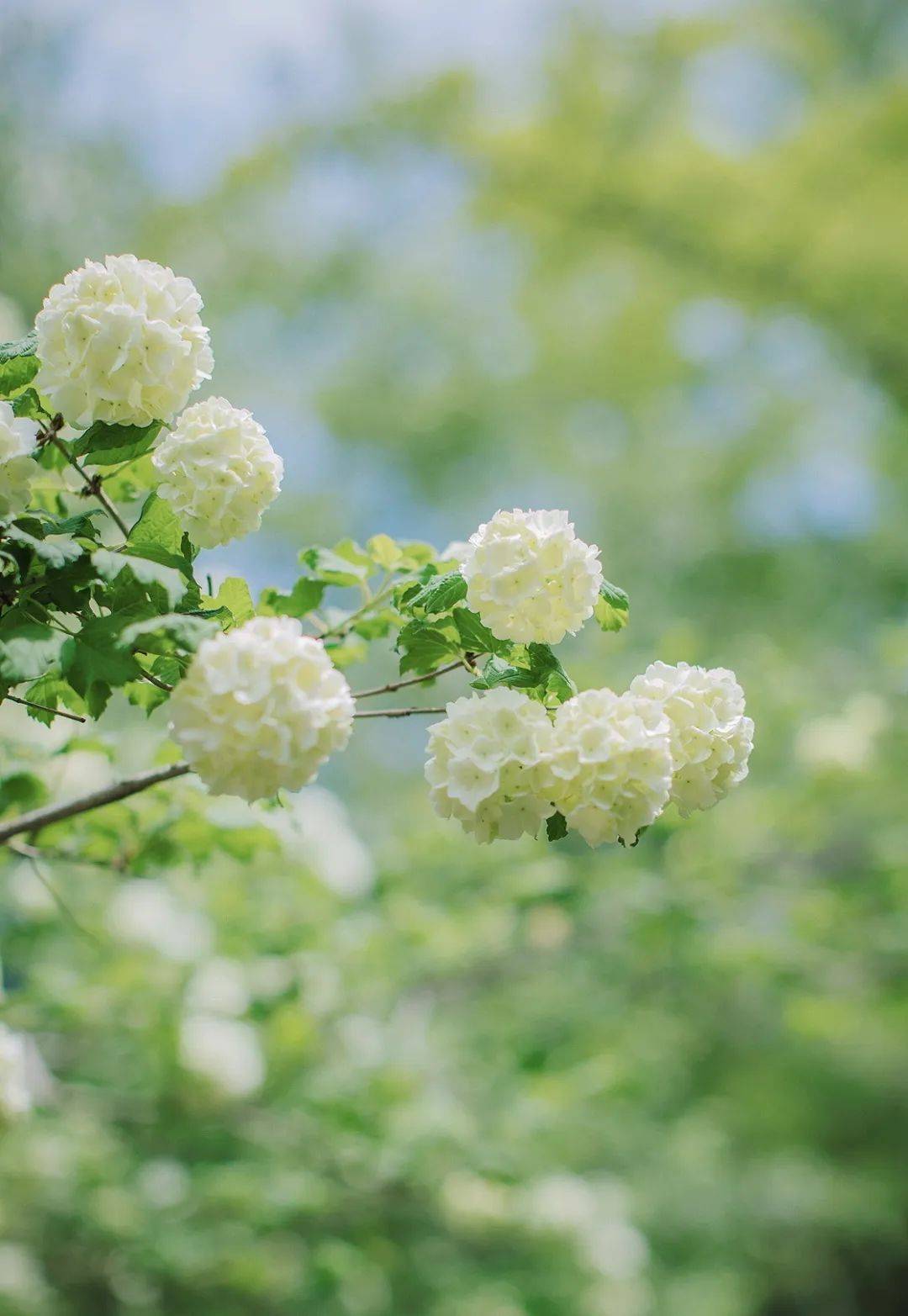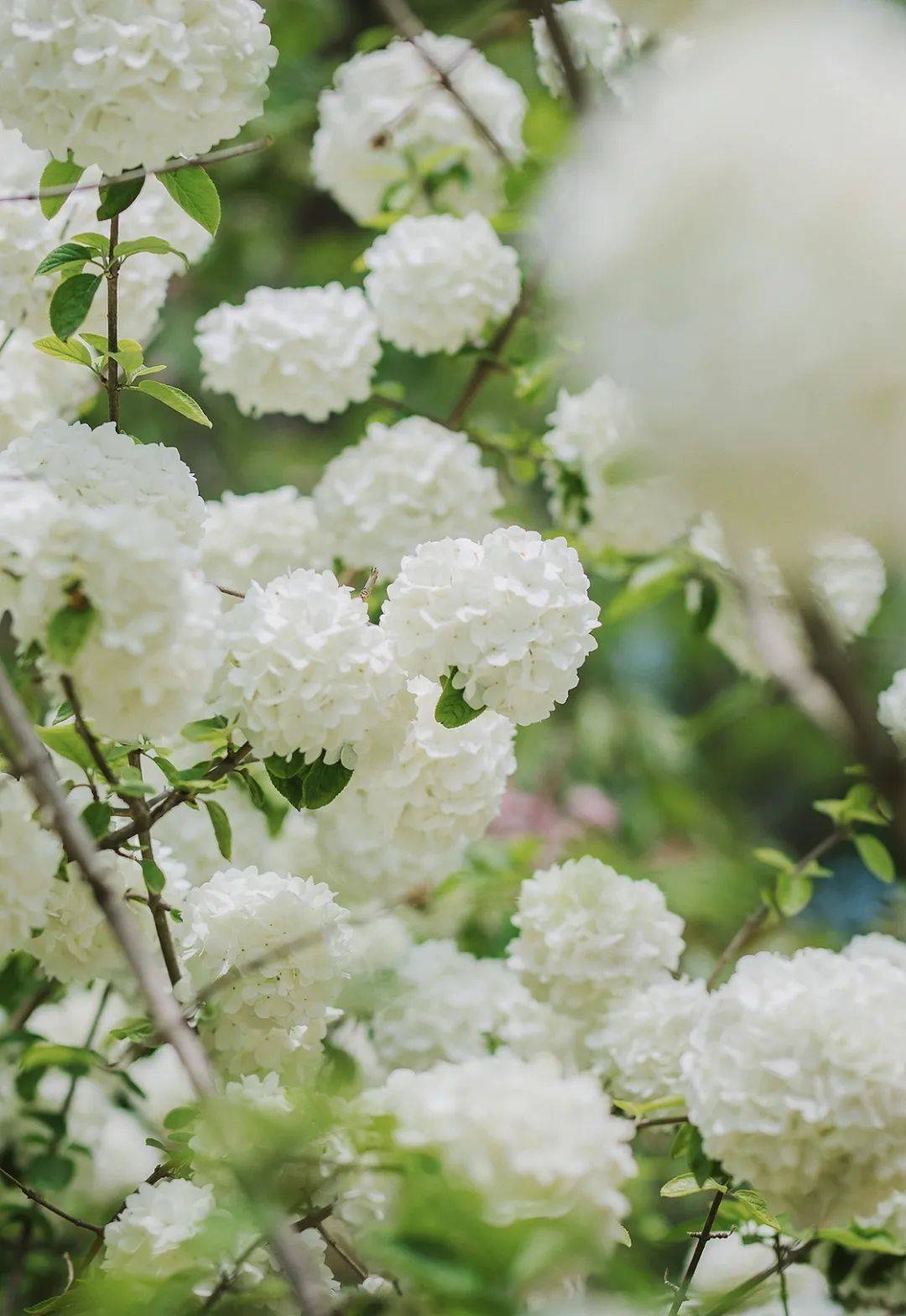木绣球像洁白而茂密的雪团,如雪一般纯净,从绿叶中伸出朵朵繁花,团团簇簇,缀在枝头。
